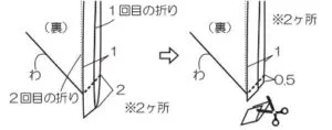 ①上下の縫い代を1.0cm裏側に折り、さらに半分に折る。