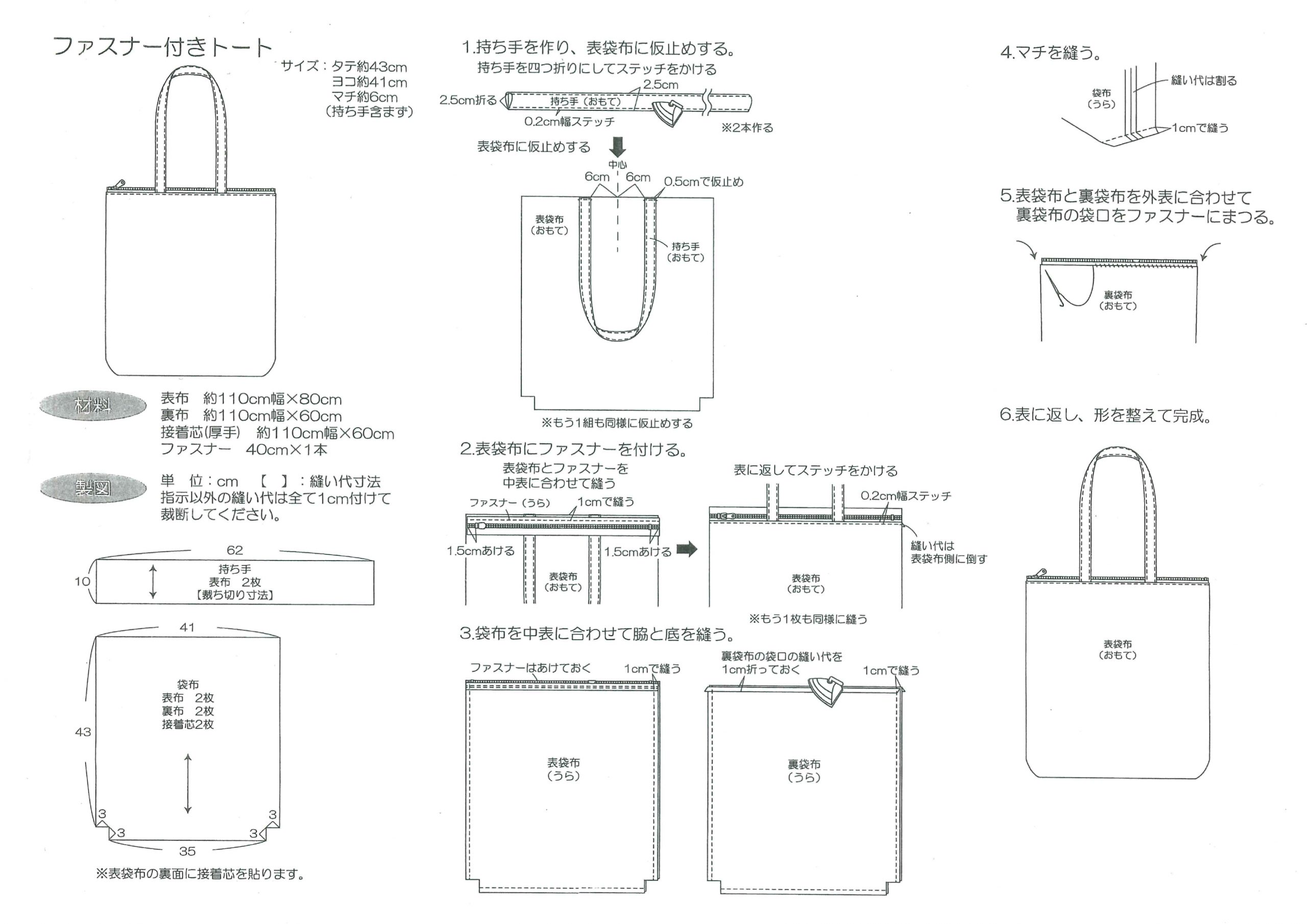 HOME > お役立ち情報・お知らせ・無料レシピ/作り方 > 無料レシピ/作り方 > 作り方講座 > レシピ付き > 【作り方・レシピ付き】ファスナー付きトート