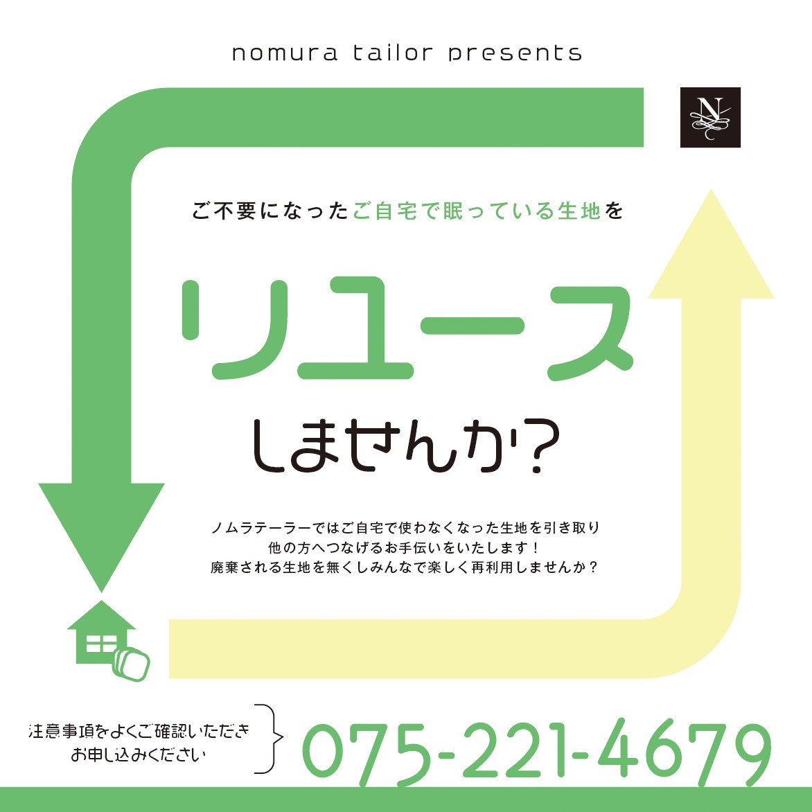 ノムラテーラーではご自宅で使わなくなった生地を引き取り、他の方へつなげるお手伝いをいたします!