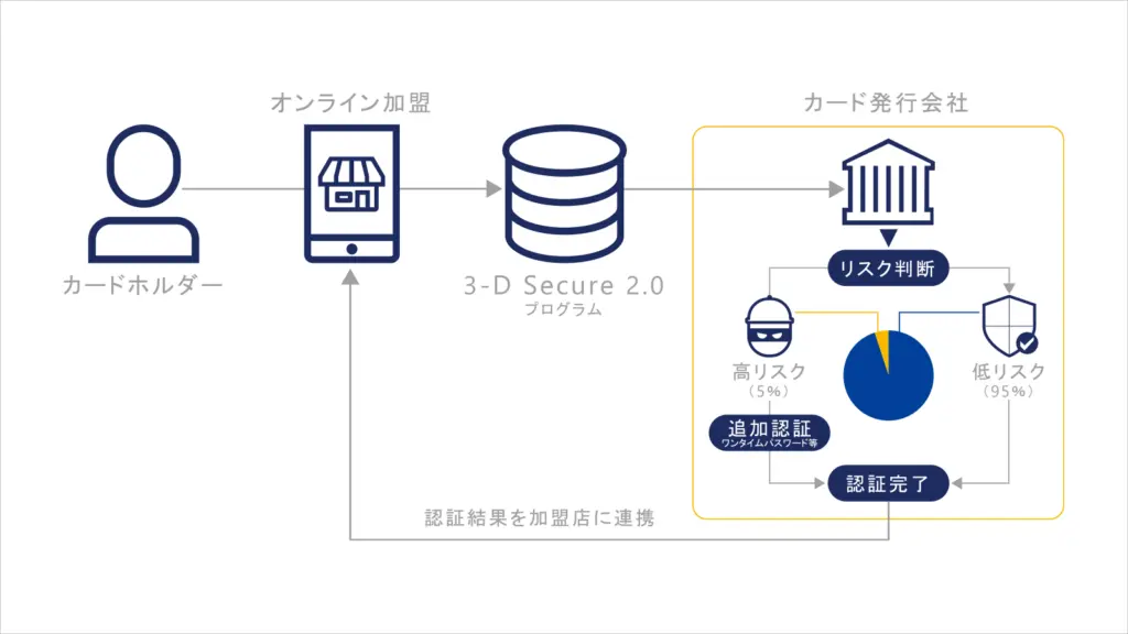 3-D Secure2.0では、リスクベースの認証をカード利用者の決済情報等を基に、取引の大半は追加認証なしに認証が完了、高リスクと判断される取引にのみ、ワンタイムパスワード等の追加認証実施します。