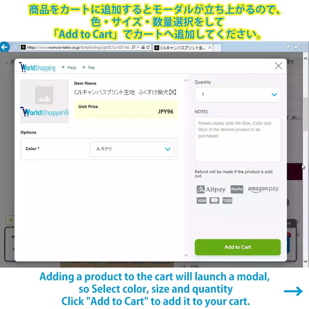 If you use WorldShopping, please click the “Add” button on the WorldShopping cart to add products to your cart.