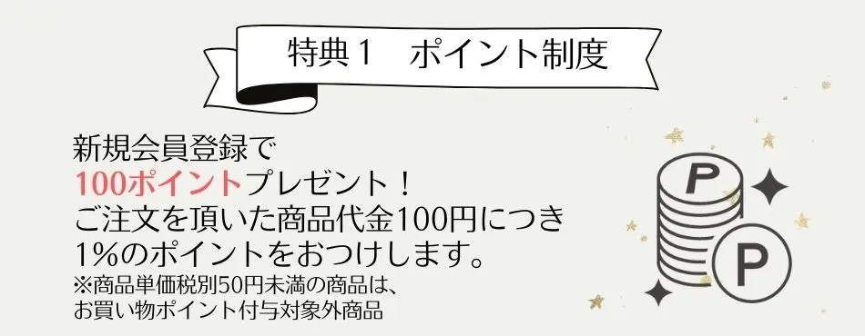 ご注文を頂いた商品代金100円につき1%のポイントをおつけします。