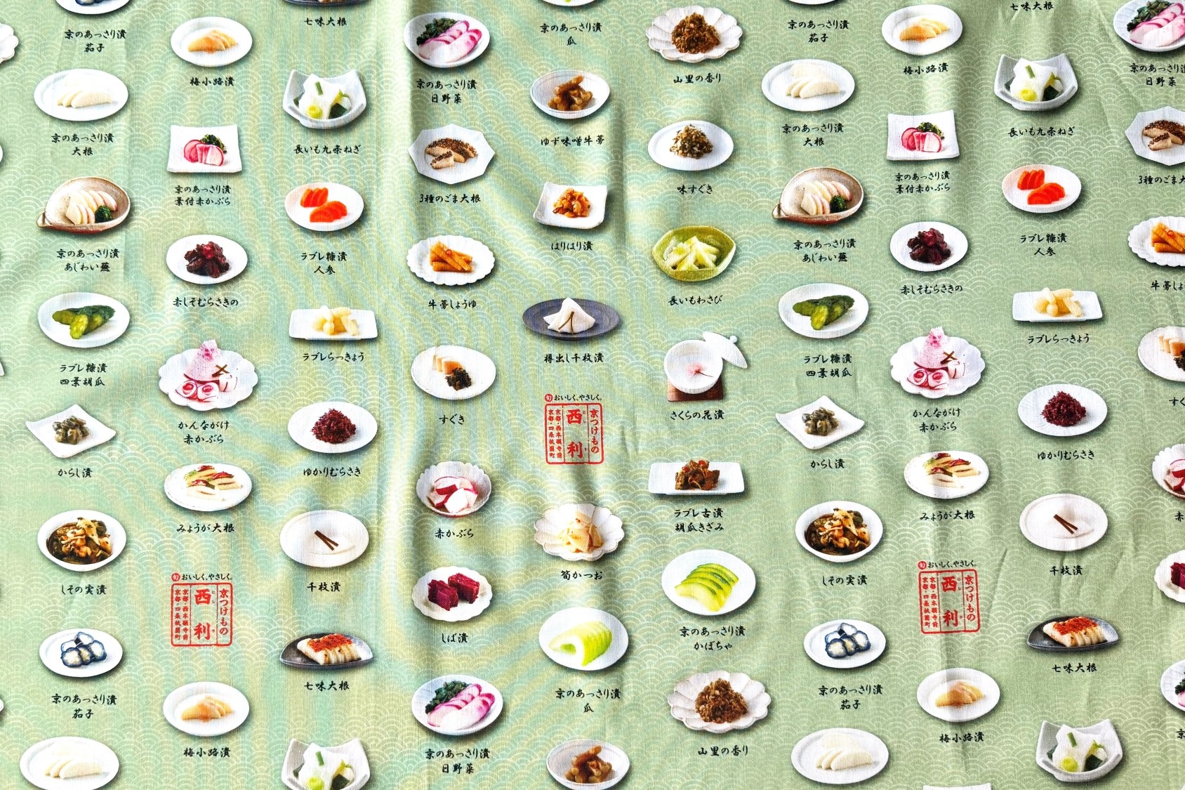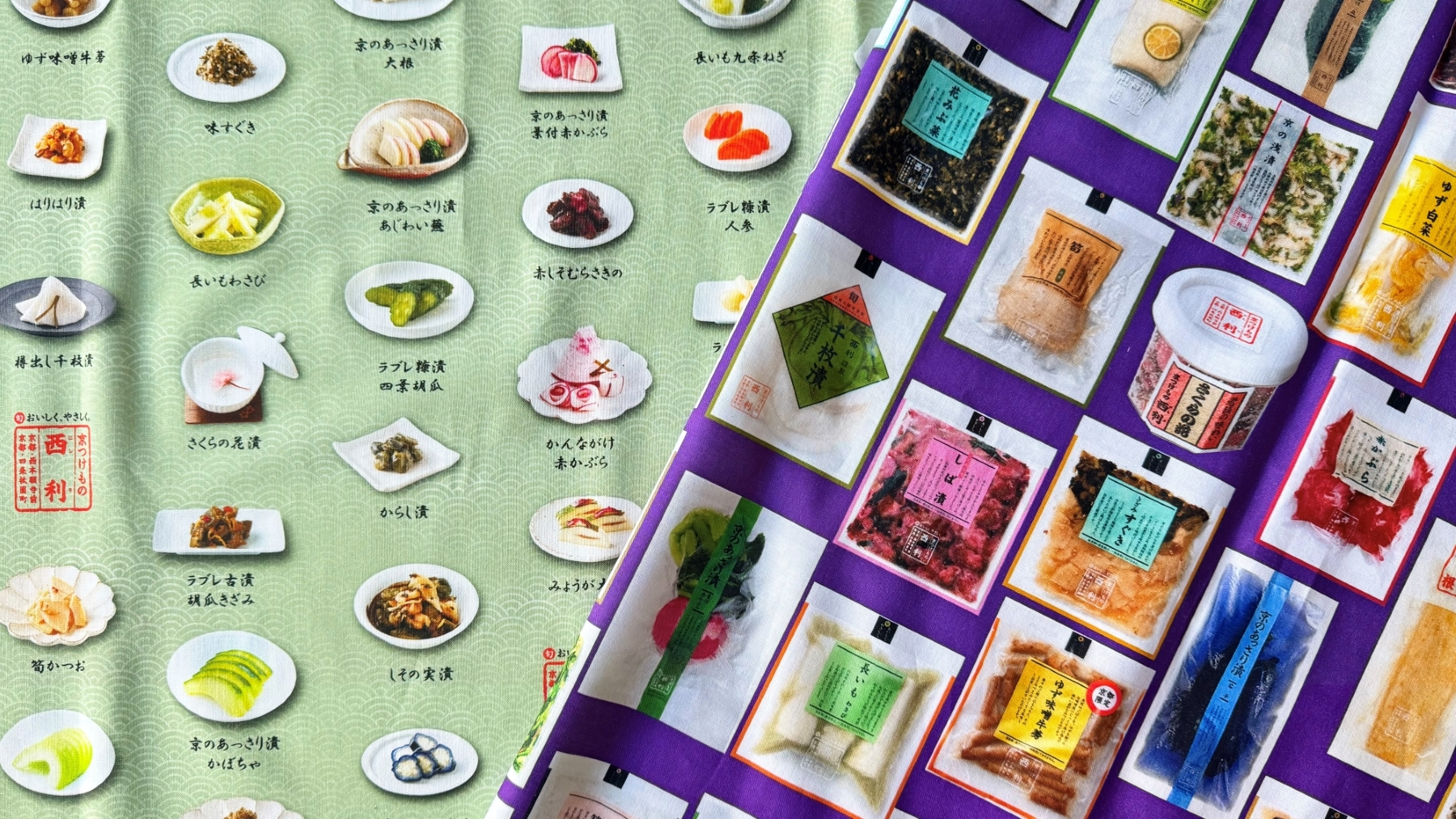 今回発売するのは、京つけもの西利の取り扱う「お漬物」を大胆にデザインした生地。
