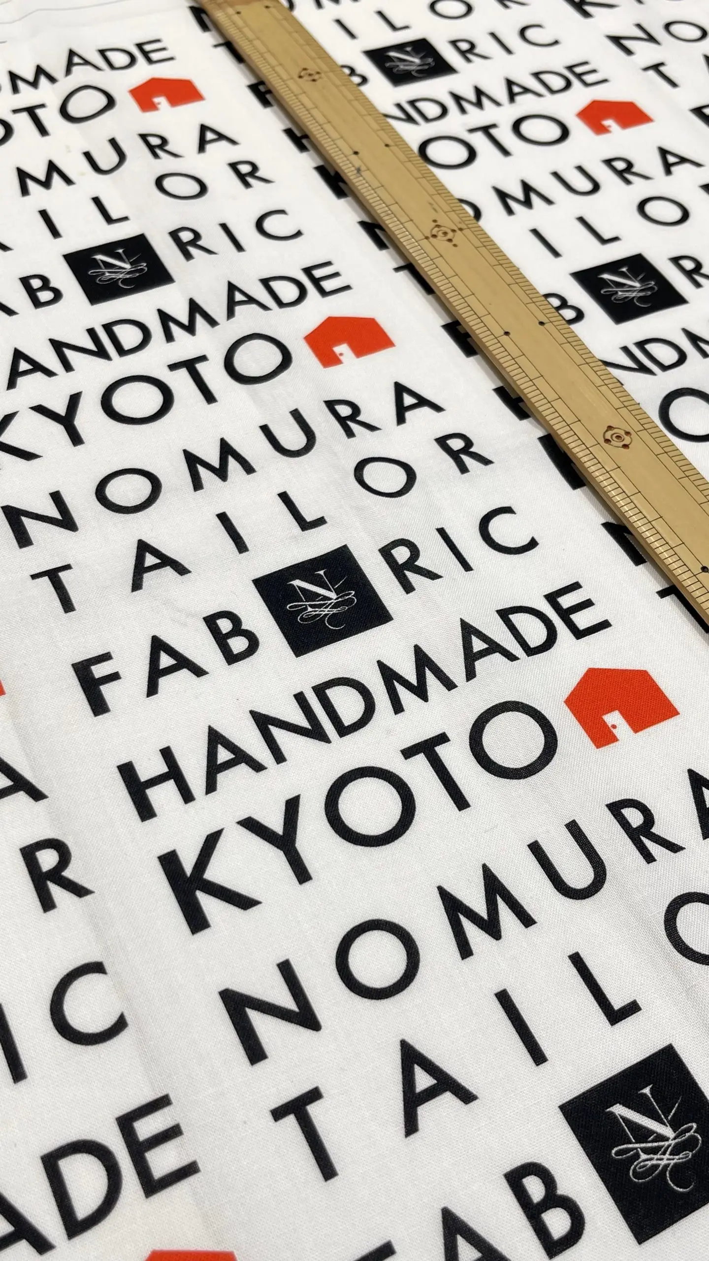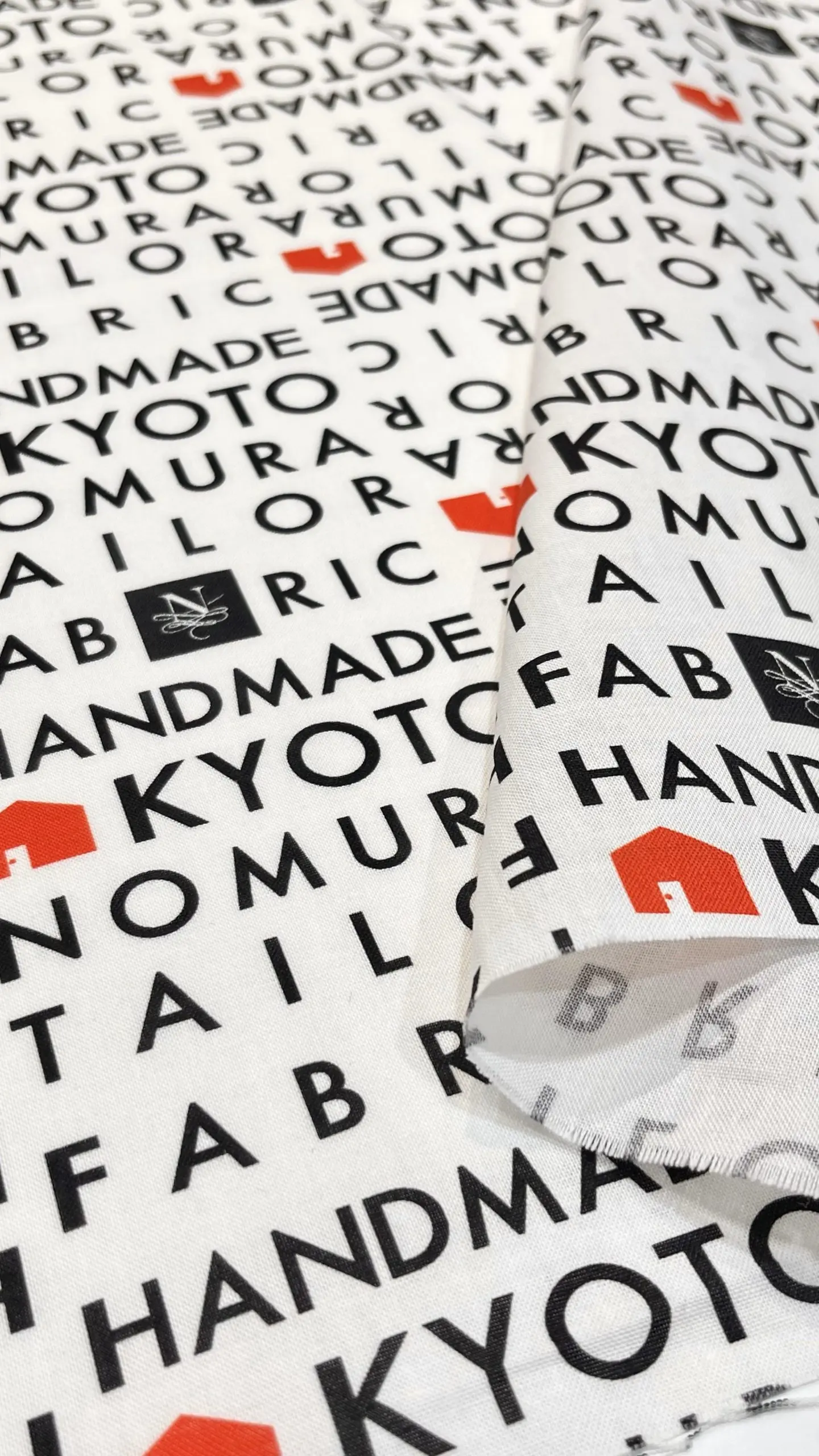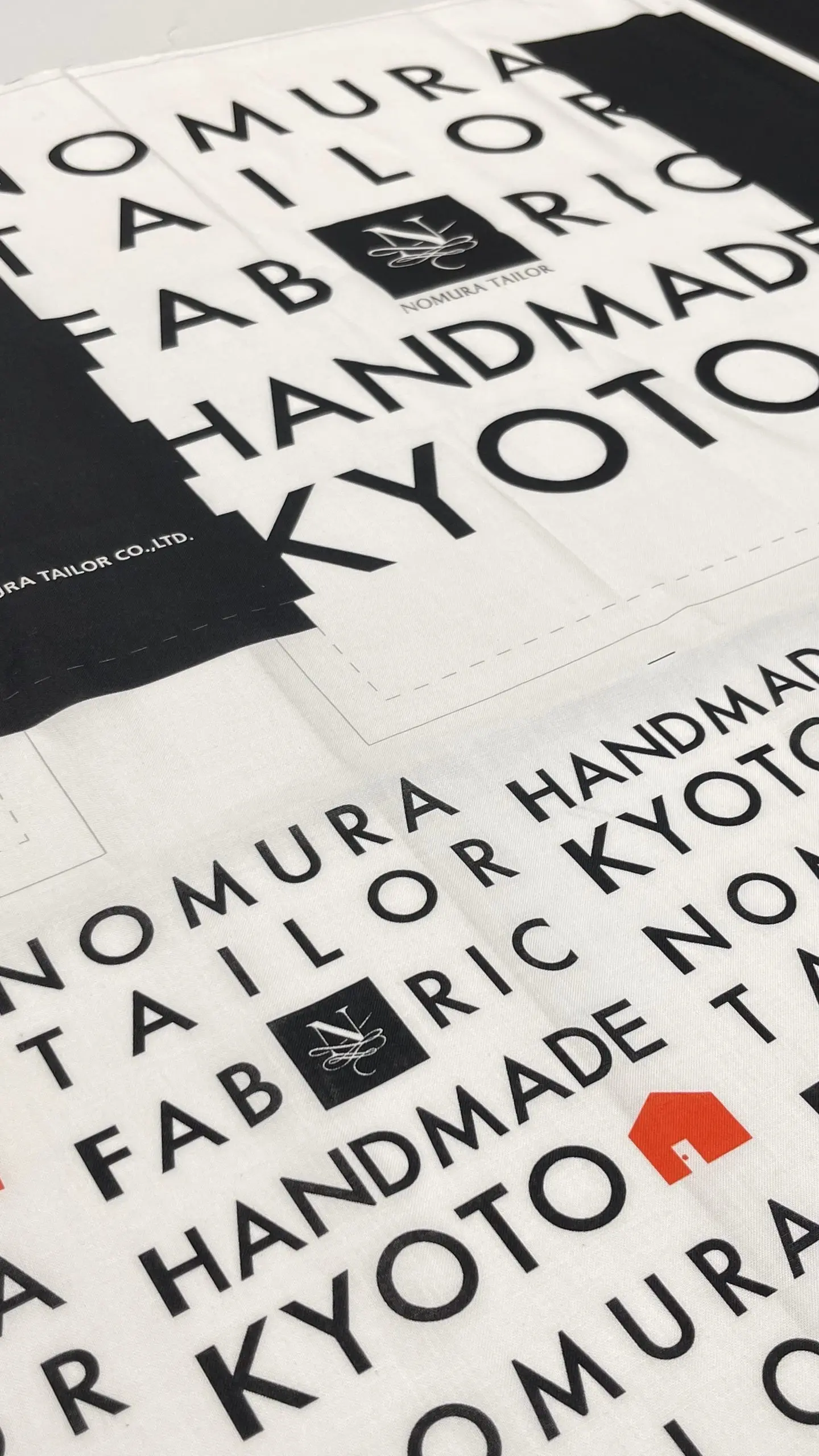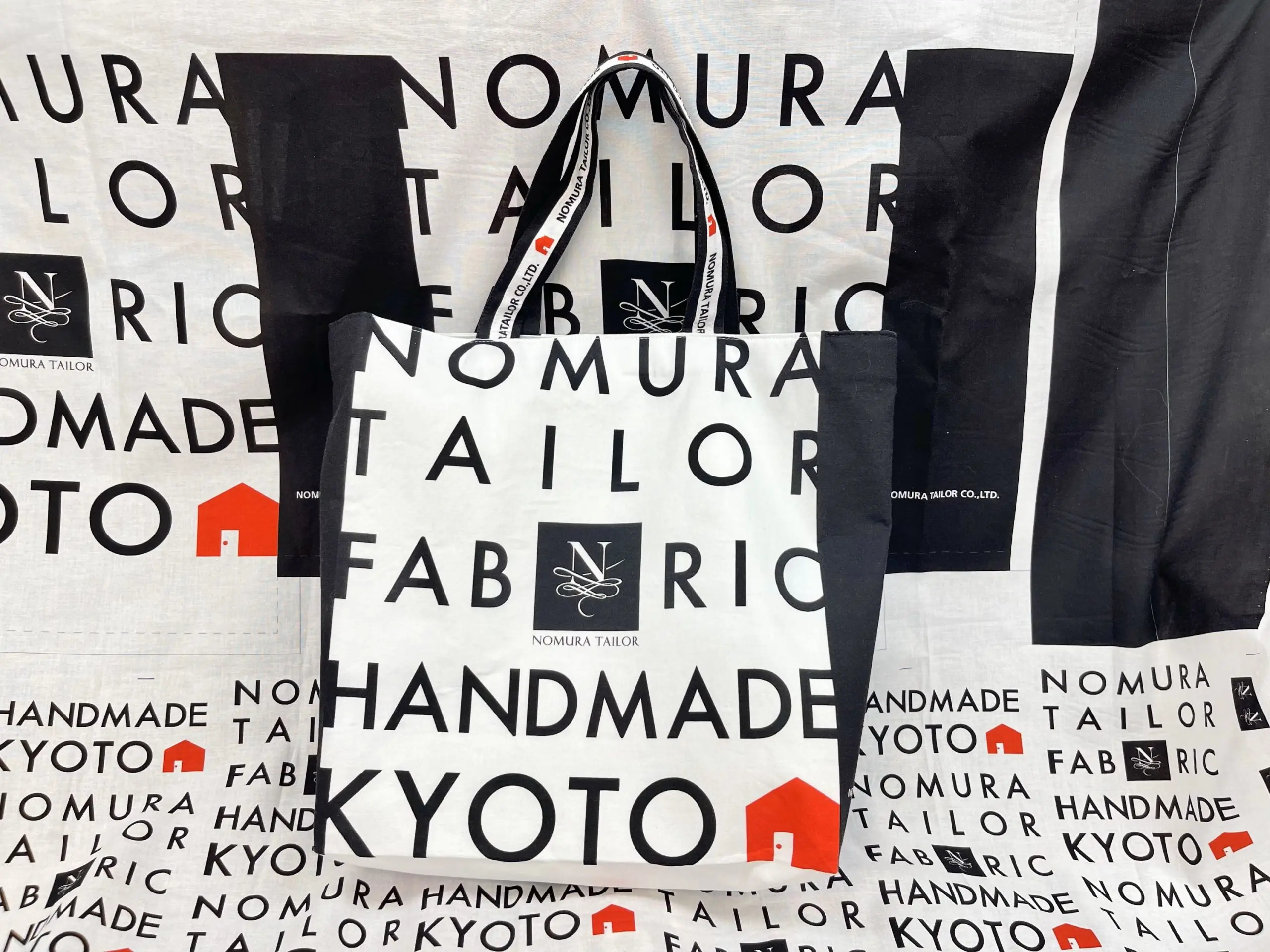 ノムラテーラーのロゴを囲むように、「KYOTO」や「FABRIC」の文字が黒字でデザインされた中に、赤いお家のマークがアクセントになったデザイン。