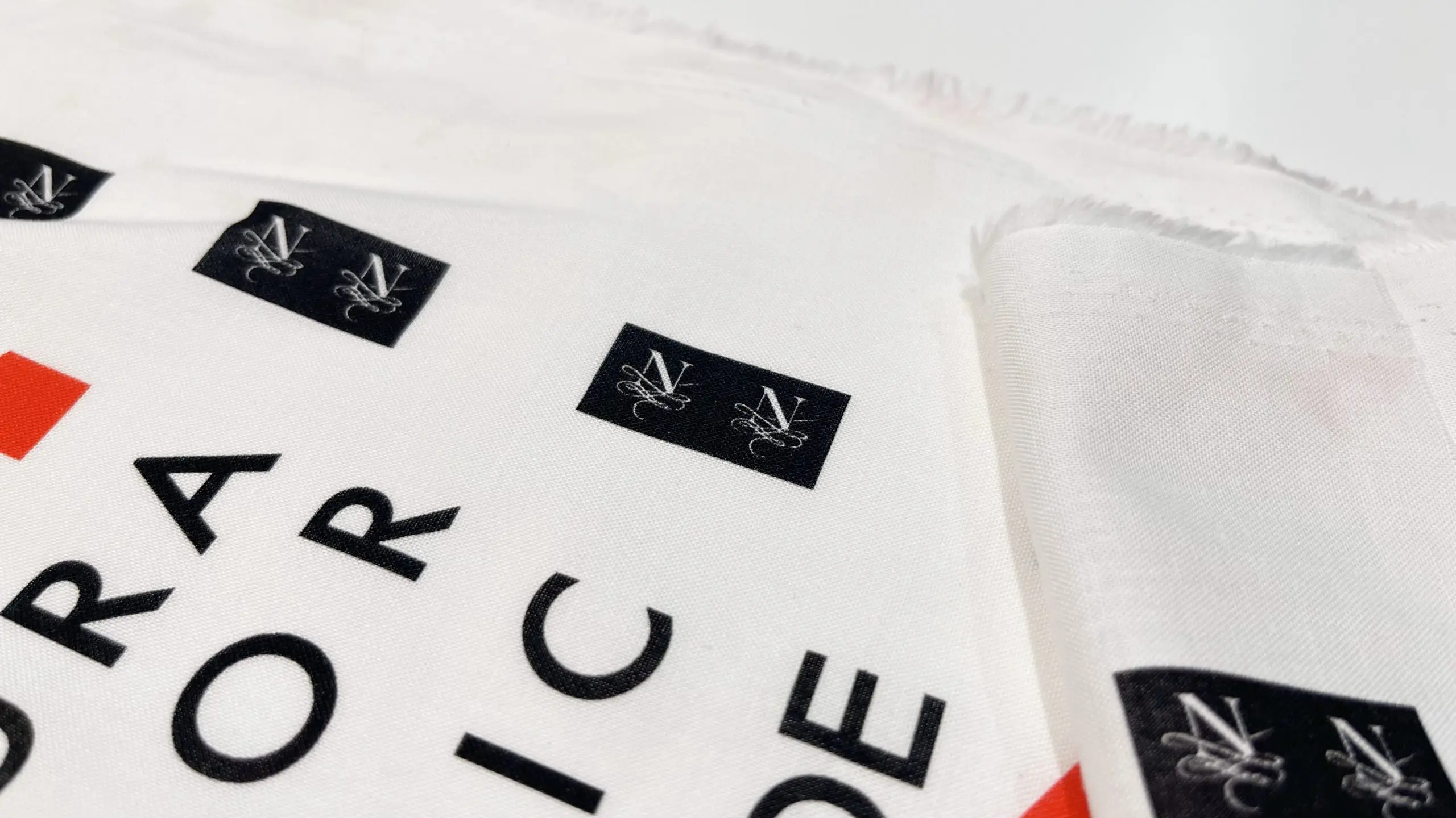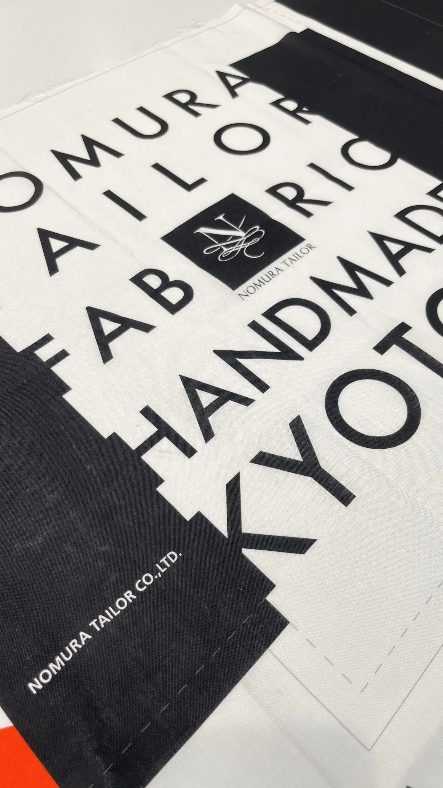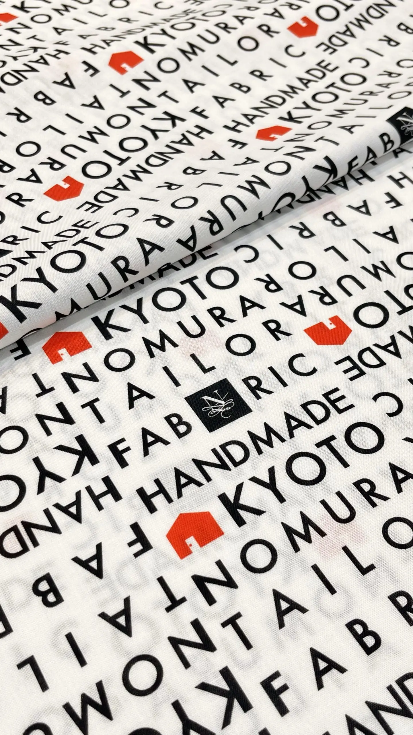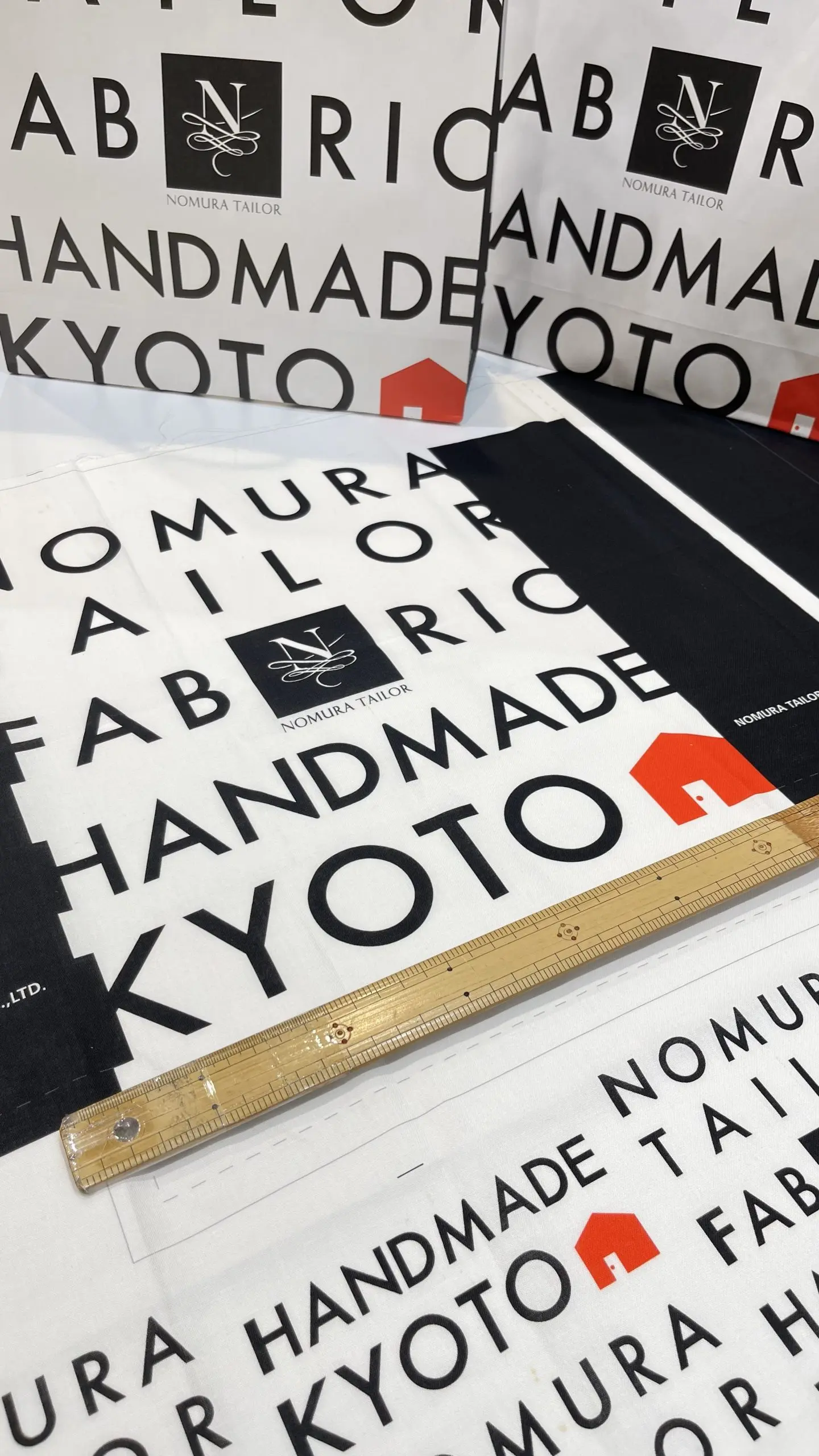 ノムラテーラーのロゴを囲むように、「KYOTO」や「FABRIC」の文字が黒字でデザインされた中に、赤いお家のマークがアクセントになったデザイン。