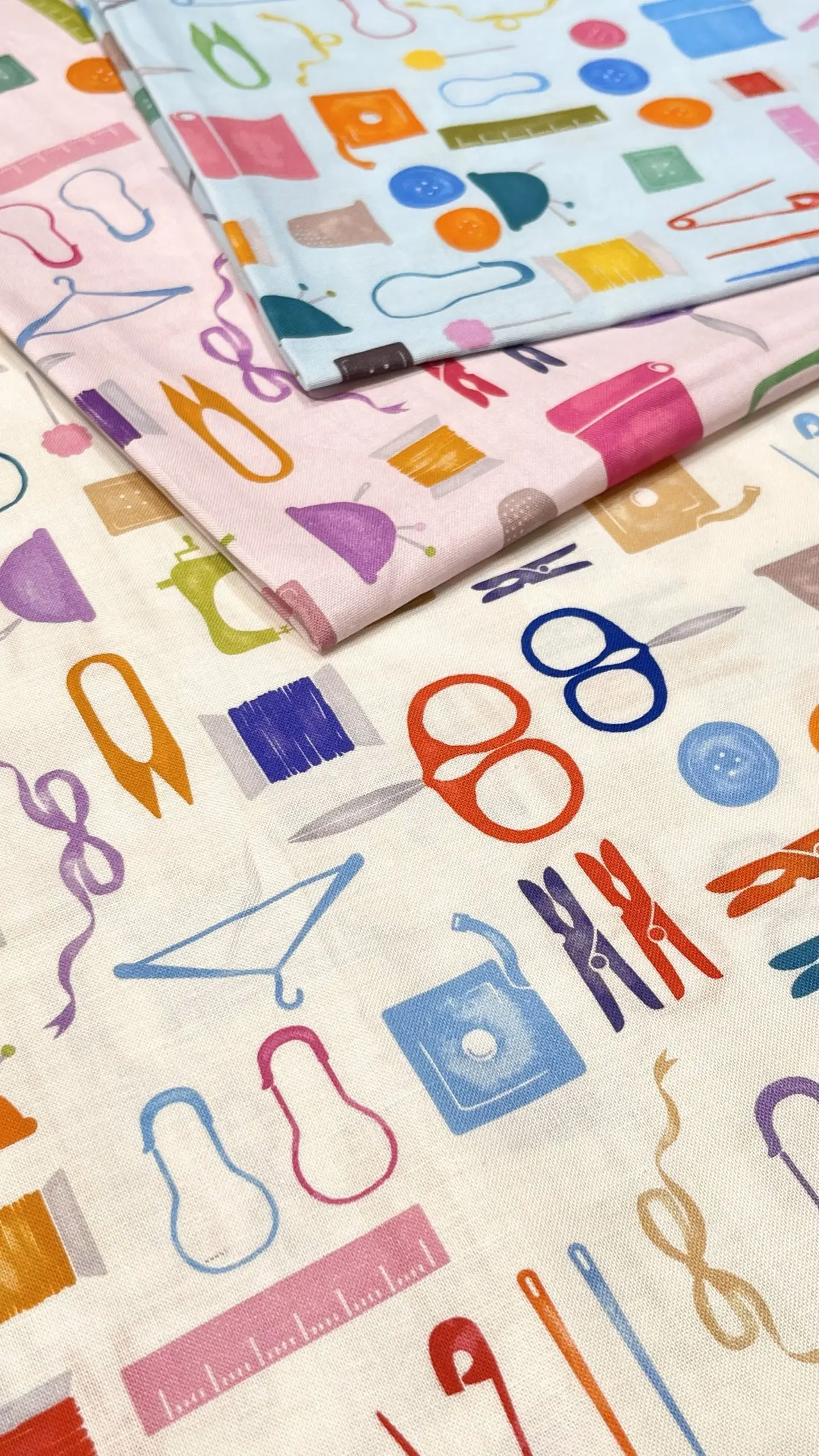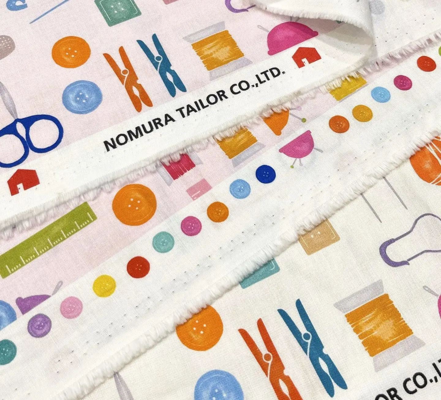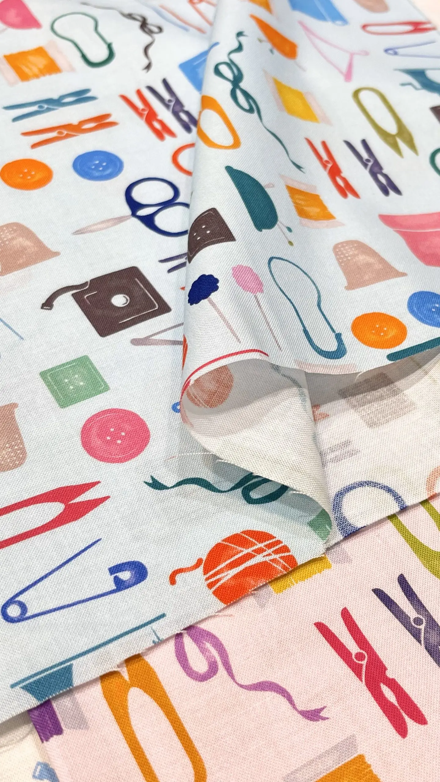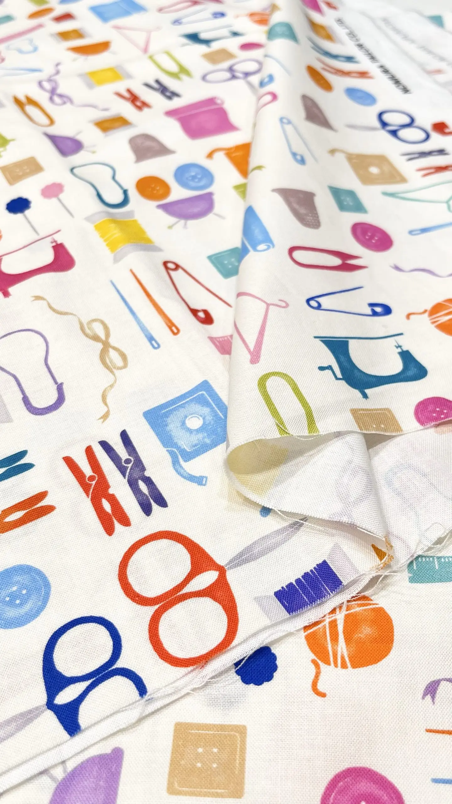 シーチングの生地にインクジェットでカラフルな手芸道具たちがプリントされています。