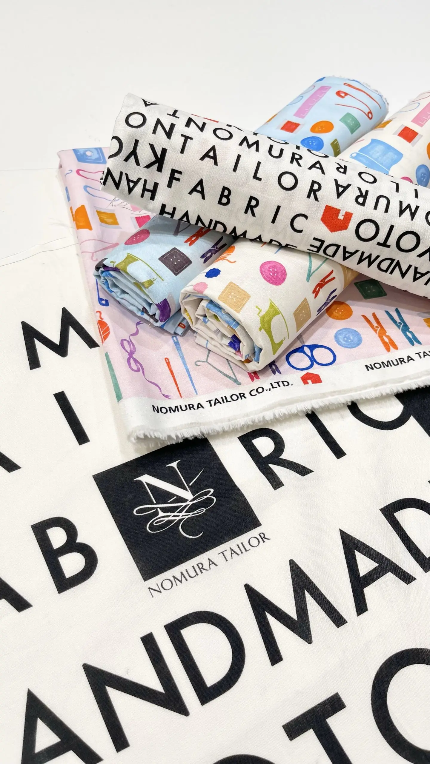 「ノムラテーラー70周年に向けて、手芸に関するモチーフを散りばめたオリジナル生地を作ってスタッフが各々色んな形で制服として着用していたところ、お客様から嬉しい反響を頂き、やっとお客様にもご提供できるように少しアレンジを加えて作る事が出来ました。