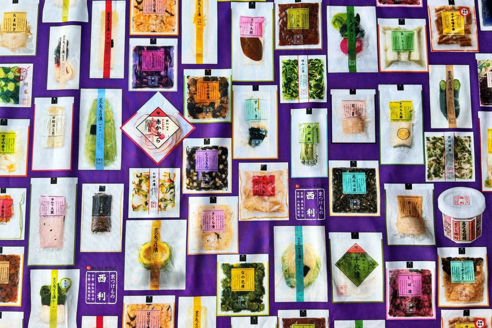 京漬物の代名詞「千枚漬」を始めとした、たくさんの漬物が名称付きでデザインされた柄と、そのパッケージをレイアウトした柄の2柄を発売いたします。