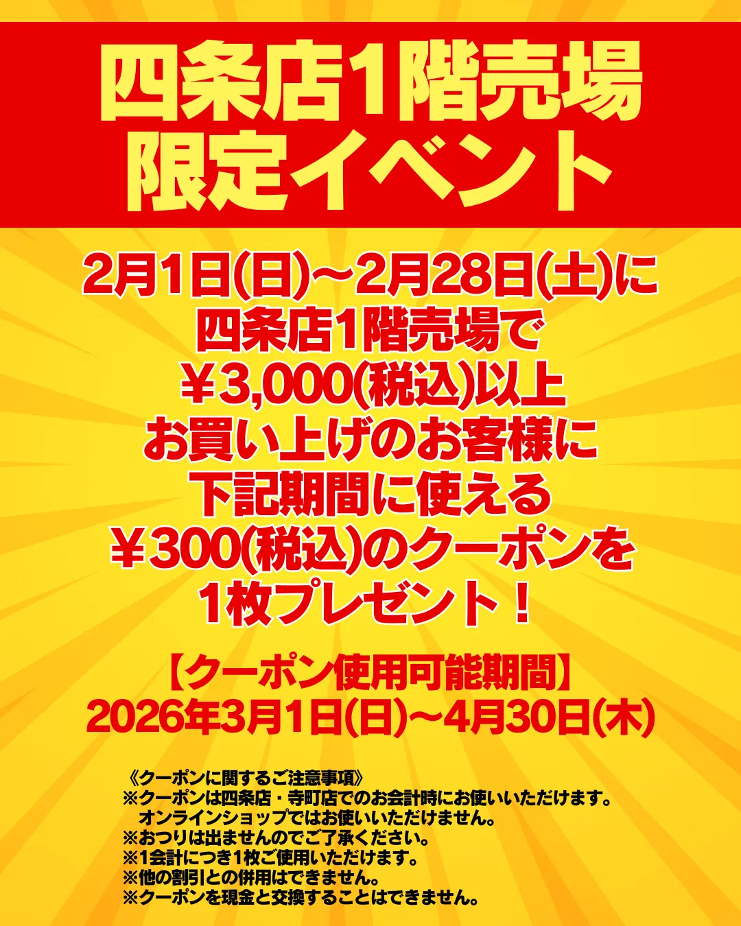 2月1日(日)~2月28日(土)に四条店1階売場で「¥3,000(税込)以上お買い上げ」のお客様に、下記期間に使える¥300(税込)のクーポンを1枚プレゼント!