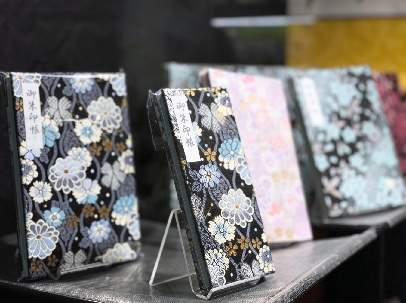 《花》をテーマに、花柄の金襴を使用した御朱印帳が並ぶ