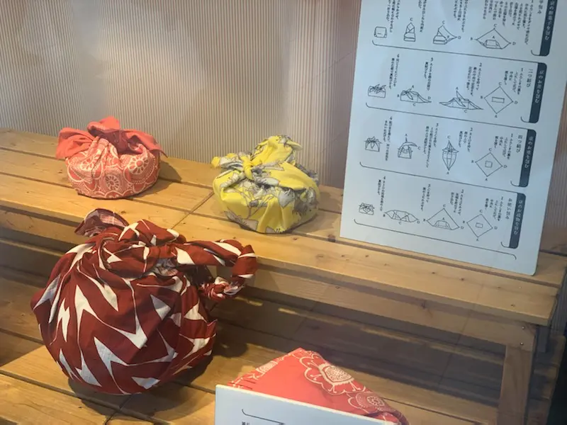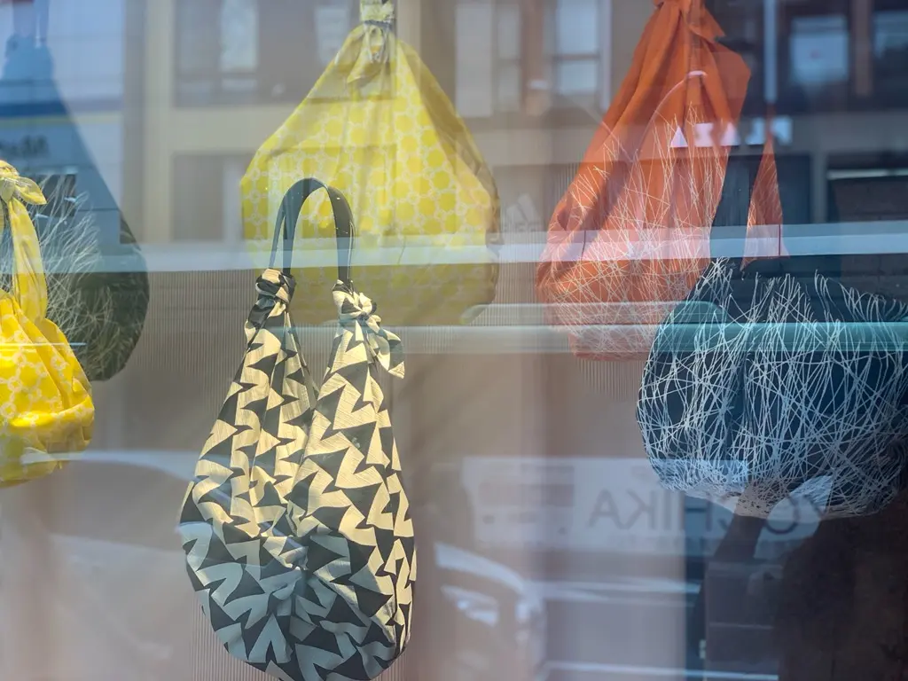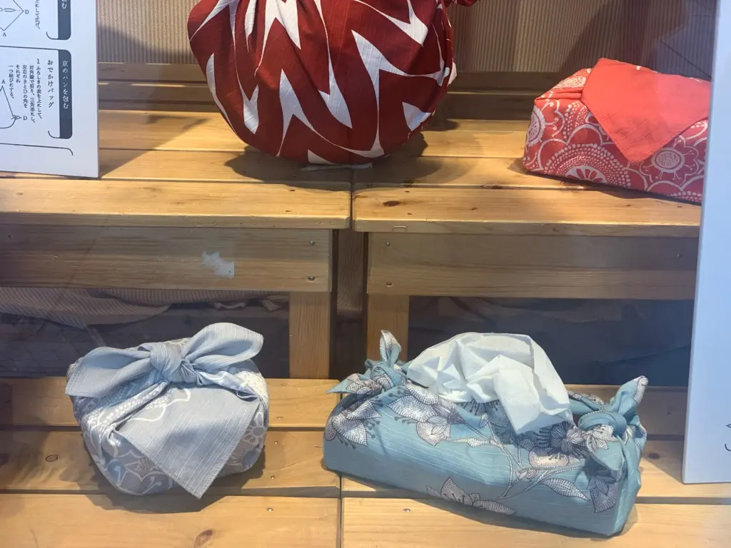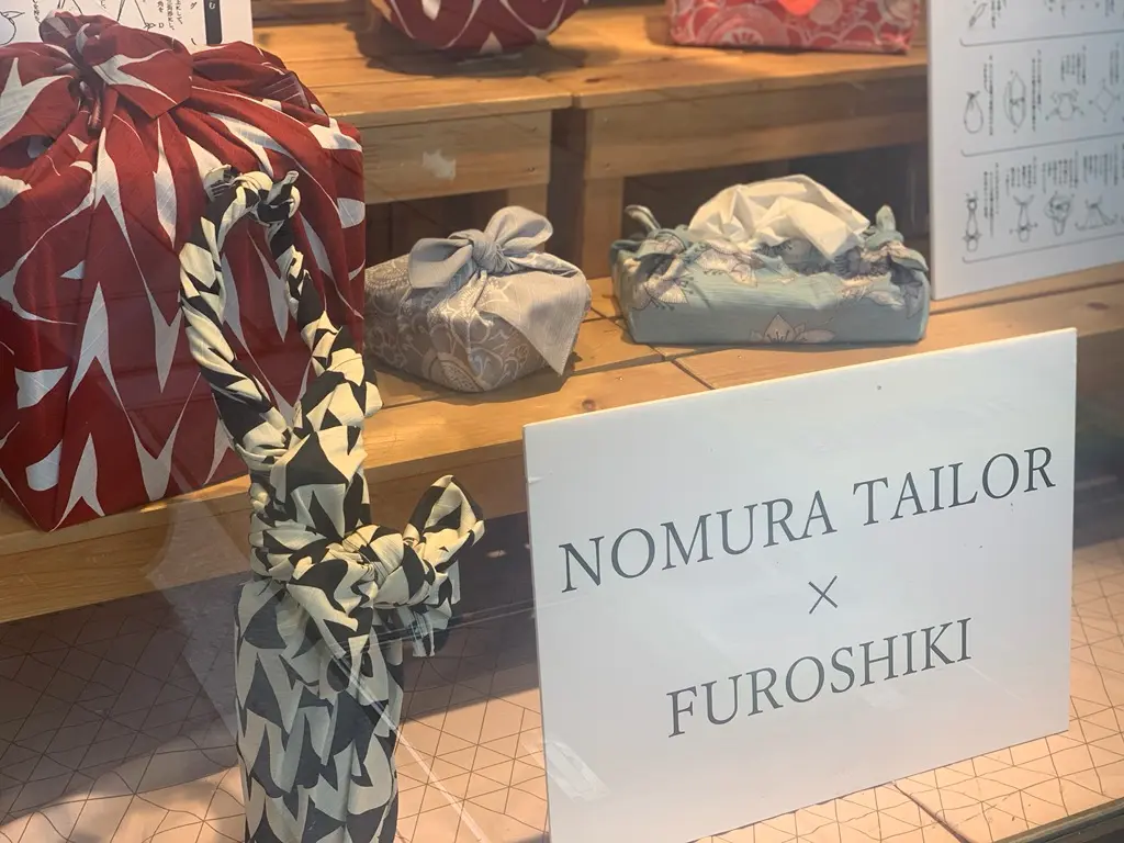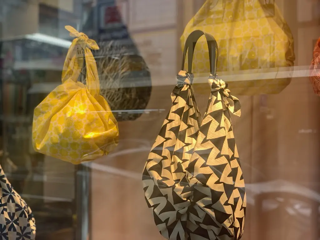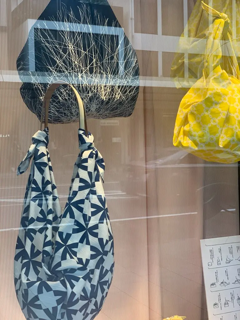 コトノワの風呂敷、そして風呂敷とレザーハンドルをつないで使う新感覚のバッグに使える「TSUNAGU」の持ち手などは、ノムラテーラー四条店 3階売場でも販売しております。