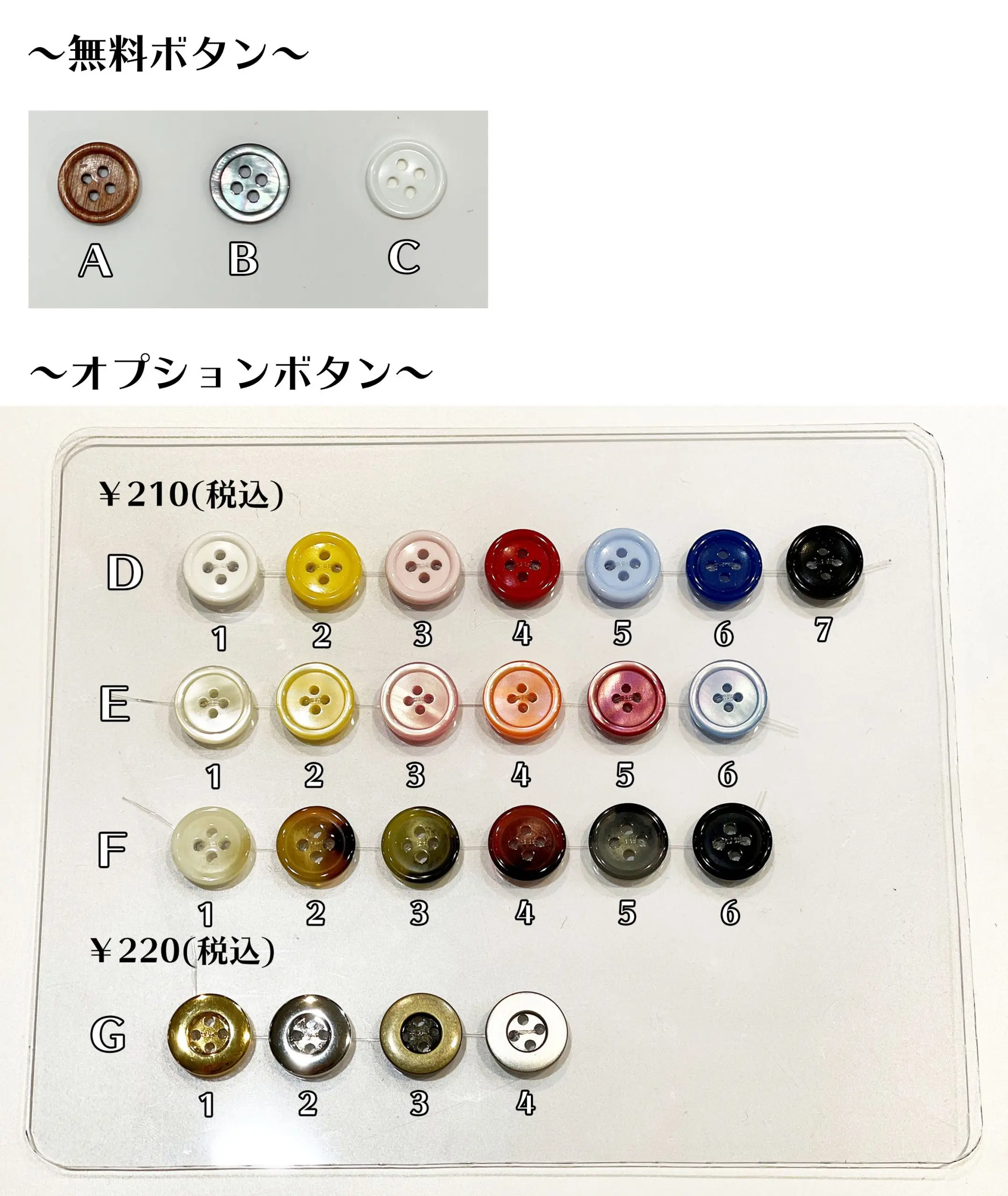 木(A)・黒貝(B)・白(C)は無料です。オプションボタンに変更する際は下記に記載の値段のオプション料がかかります。