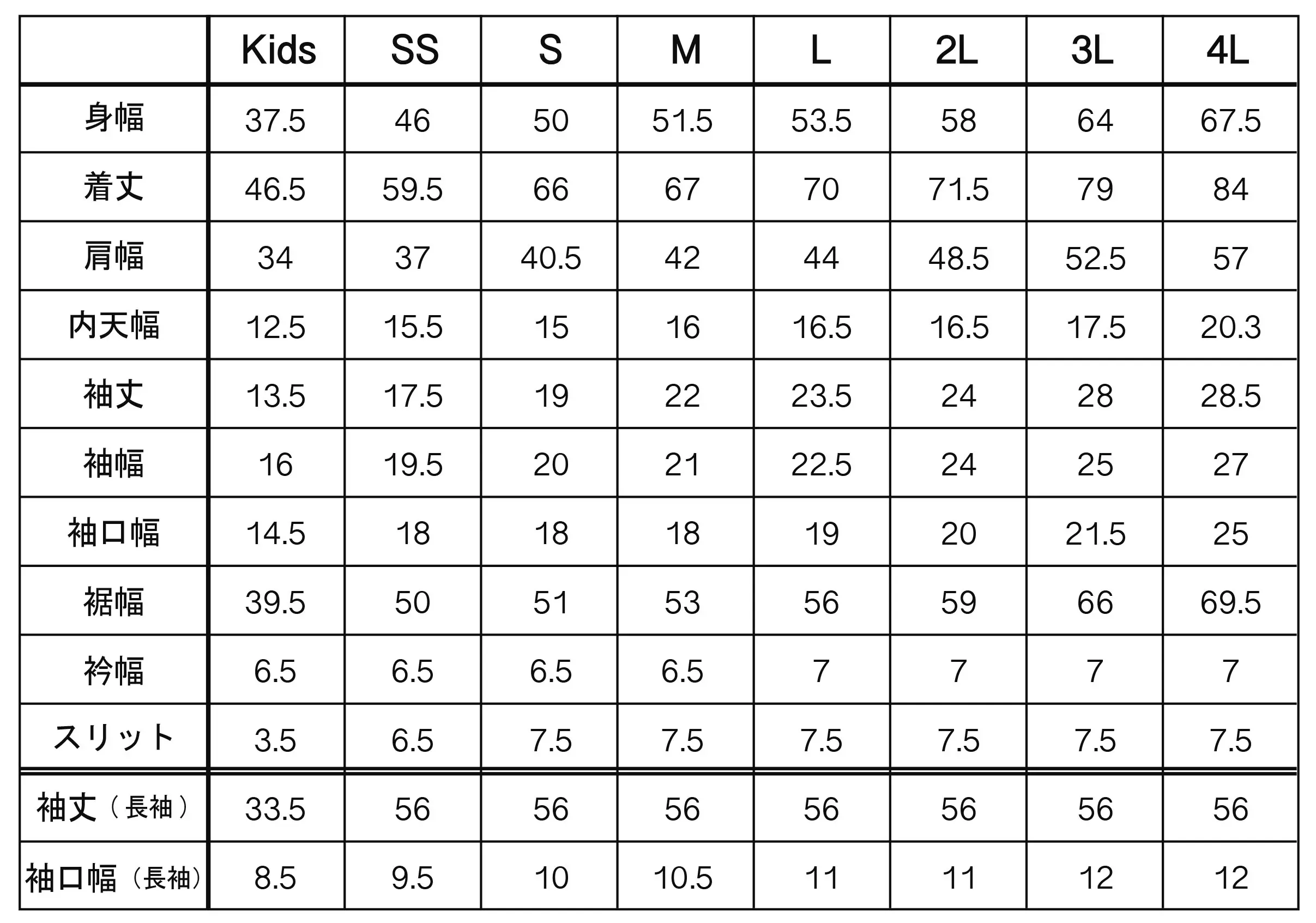 【仕上がりサイズ(全て半身/cm)】