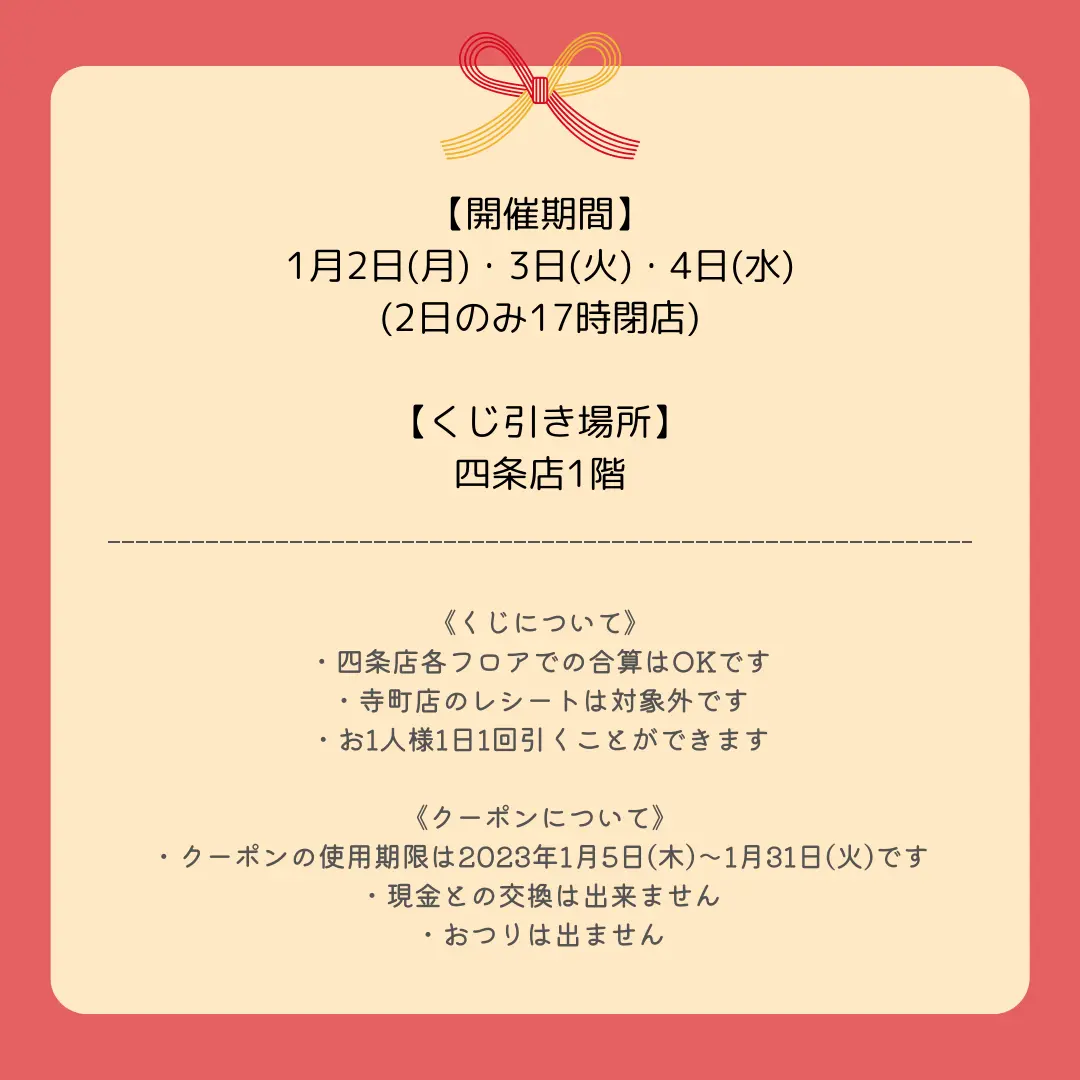 ノムラテーラー四条店にて下記期間中に3,300円(税込)以上お買い上げのお客様はくじをお引きいただけます!