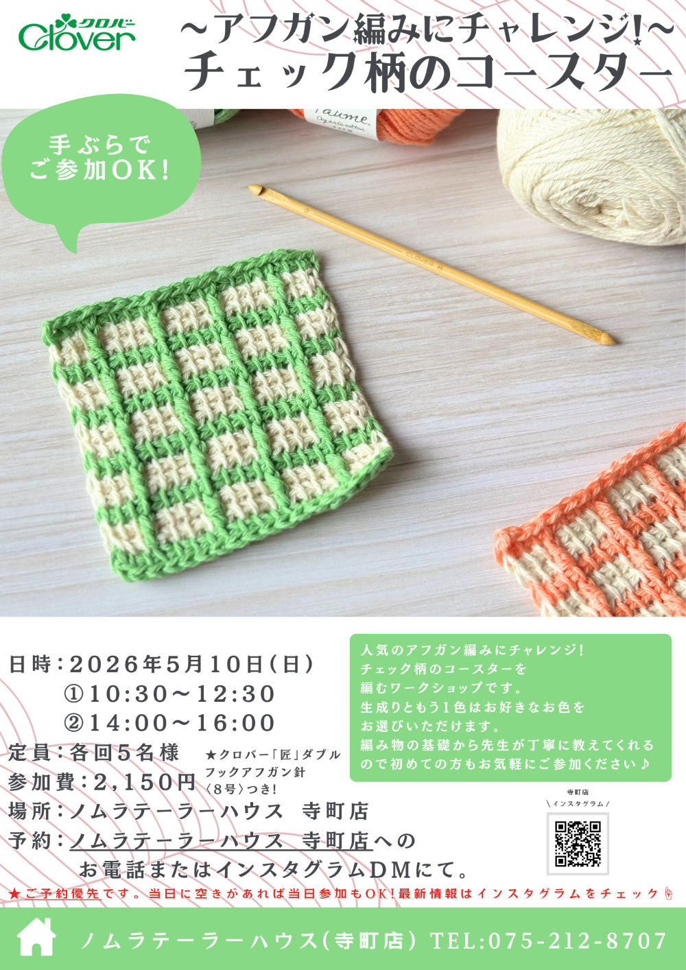 HOME > 会社情報:ノムラテーラーとは > お知らせ > 寺町店のこと > 5月開催 アフガン編みワークショップ