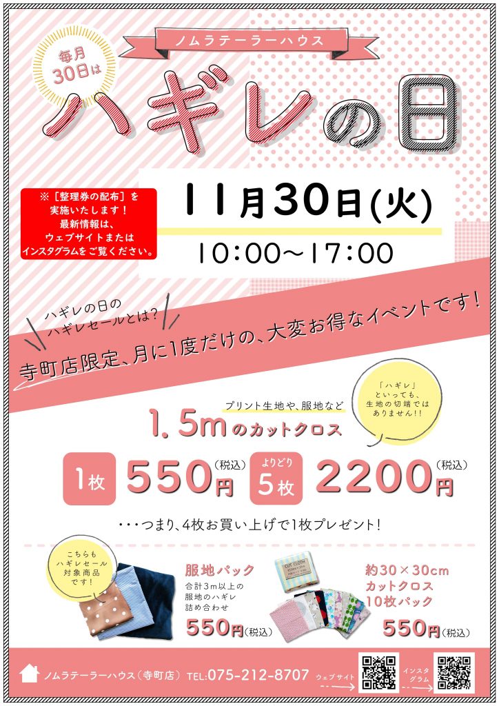 HOME > 会社情報:ノムラテーラーとは > お知らせ > 寺町店のこと > 【寺町店】次回ハギレセールのお知らせ【11月30日(火)】