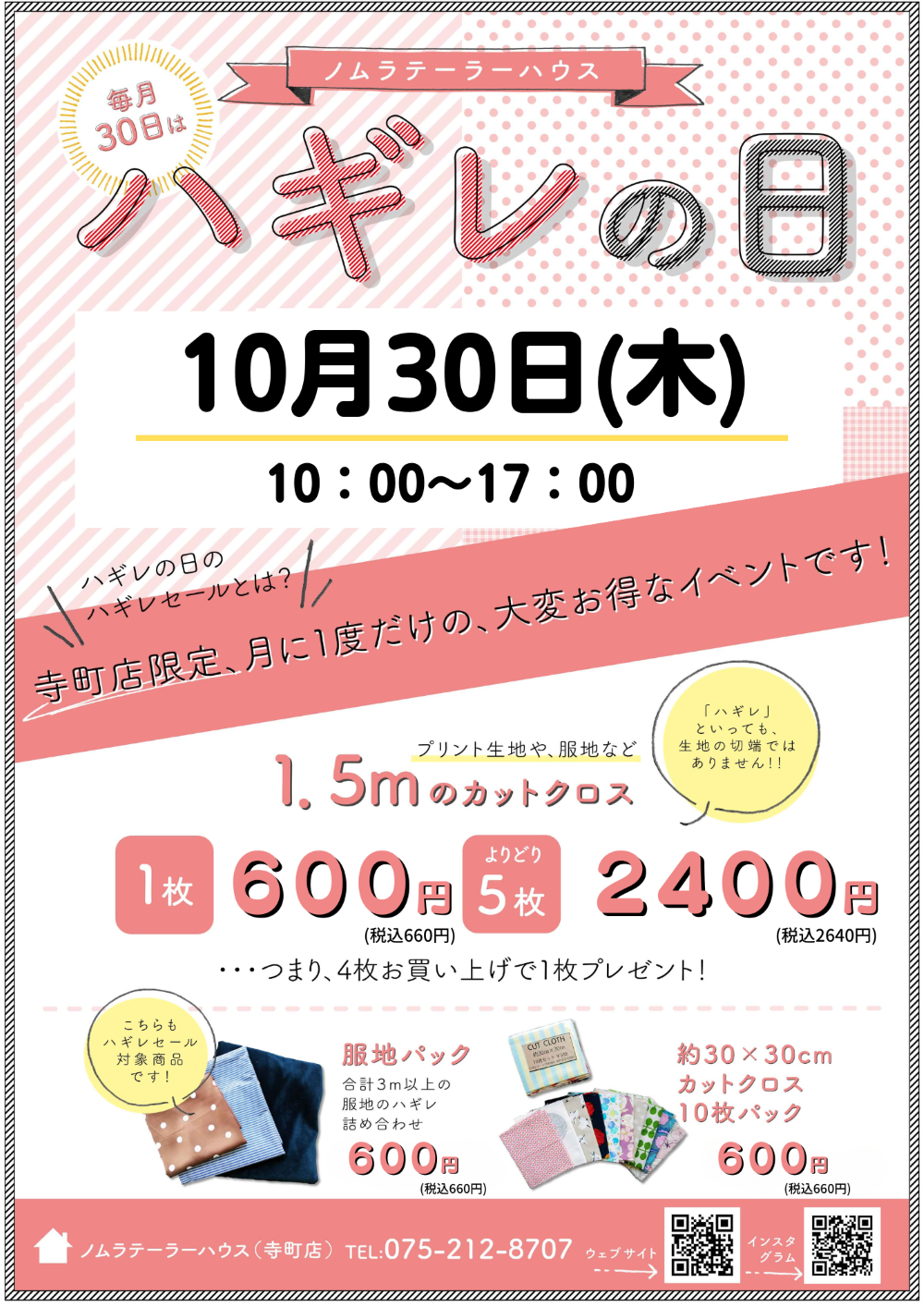 HOME > 会社情報:ノムラテーラーとは > お知らせ > 寺町店のこと > 10月ハギレセールのお知らせ