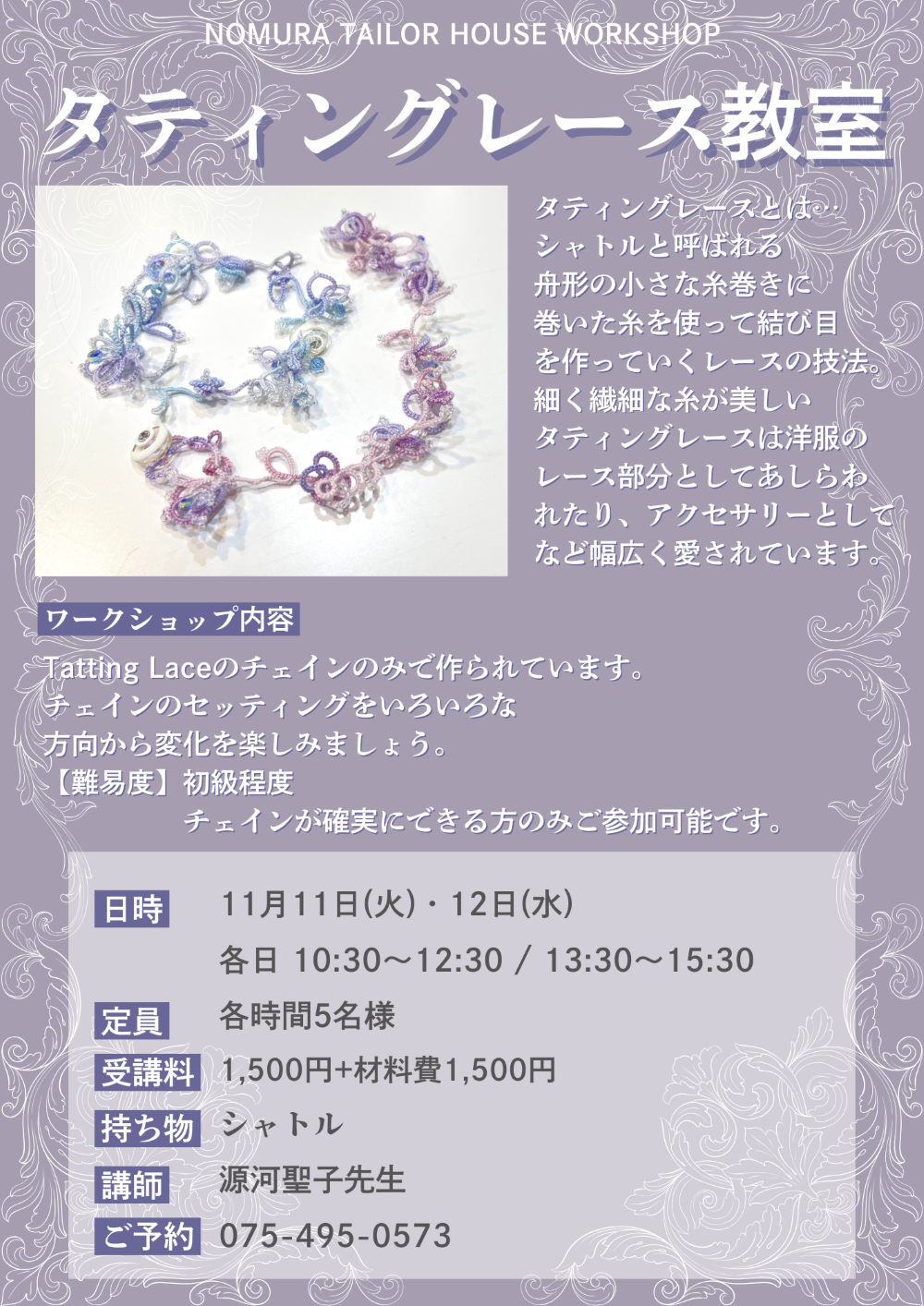 HOME > 会社情報:ノムラテーラーとは > お知らせ > 寺町店のこと > 11月・12月ワークショップのお知らせ