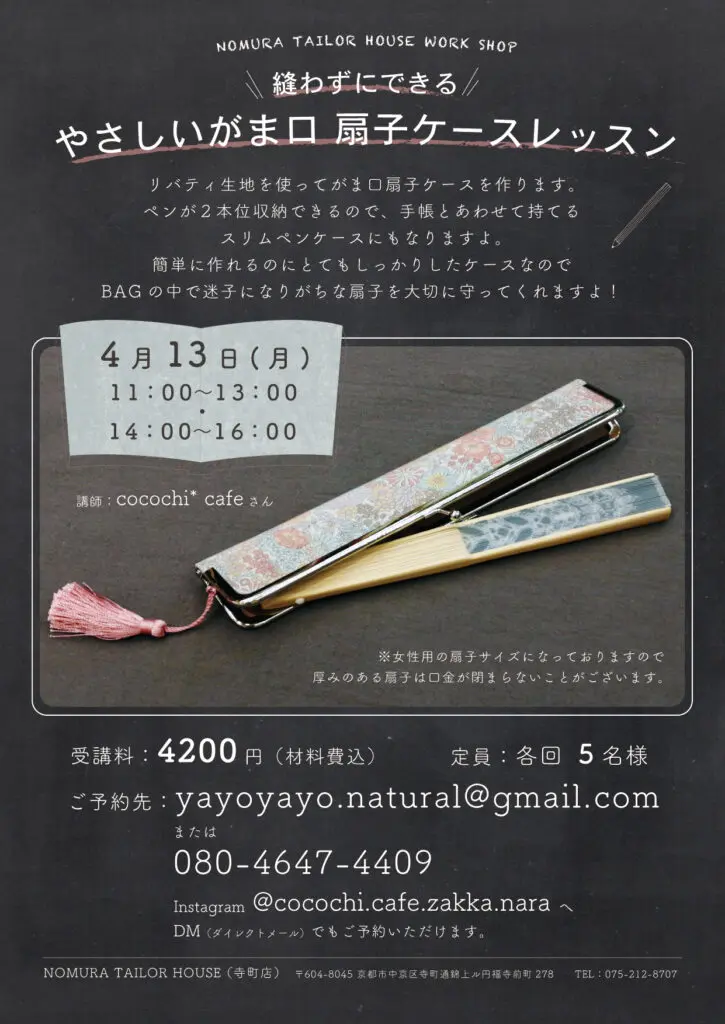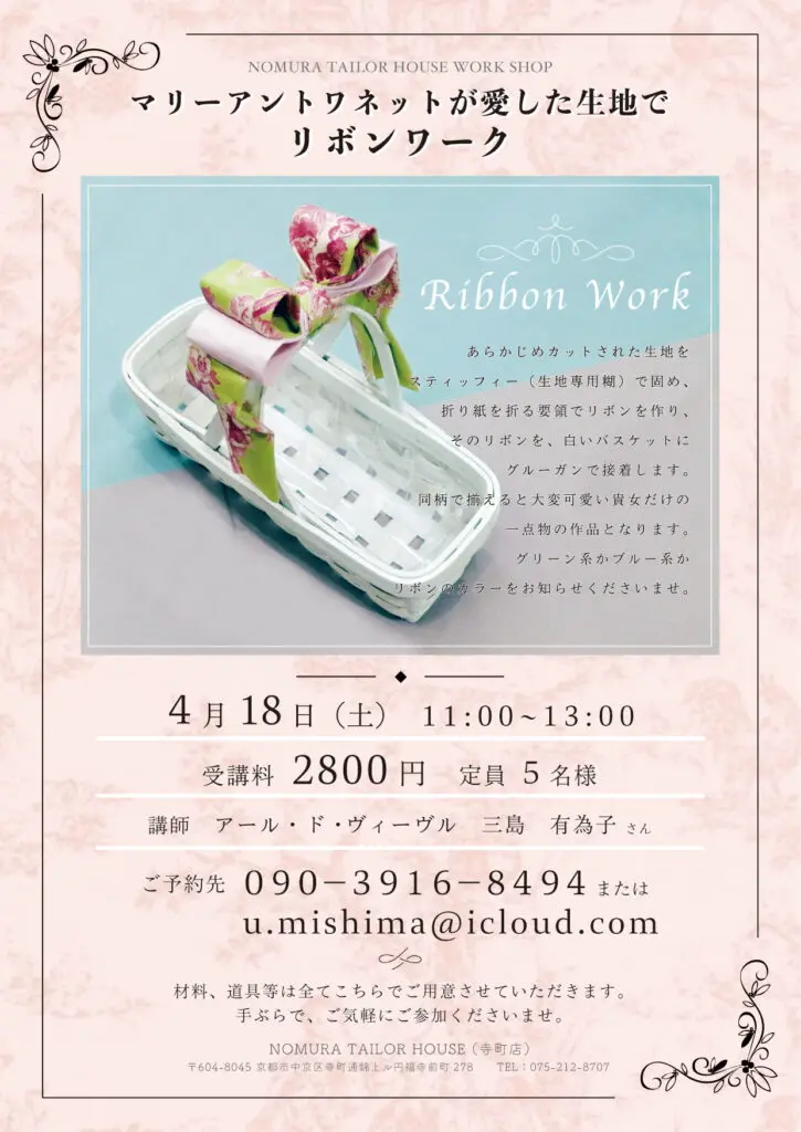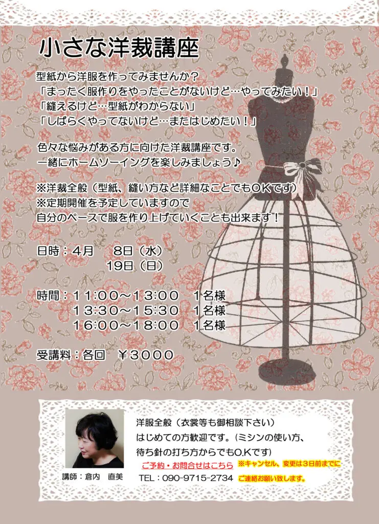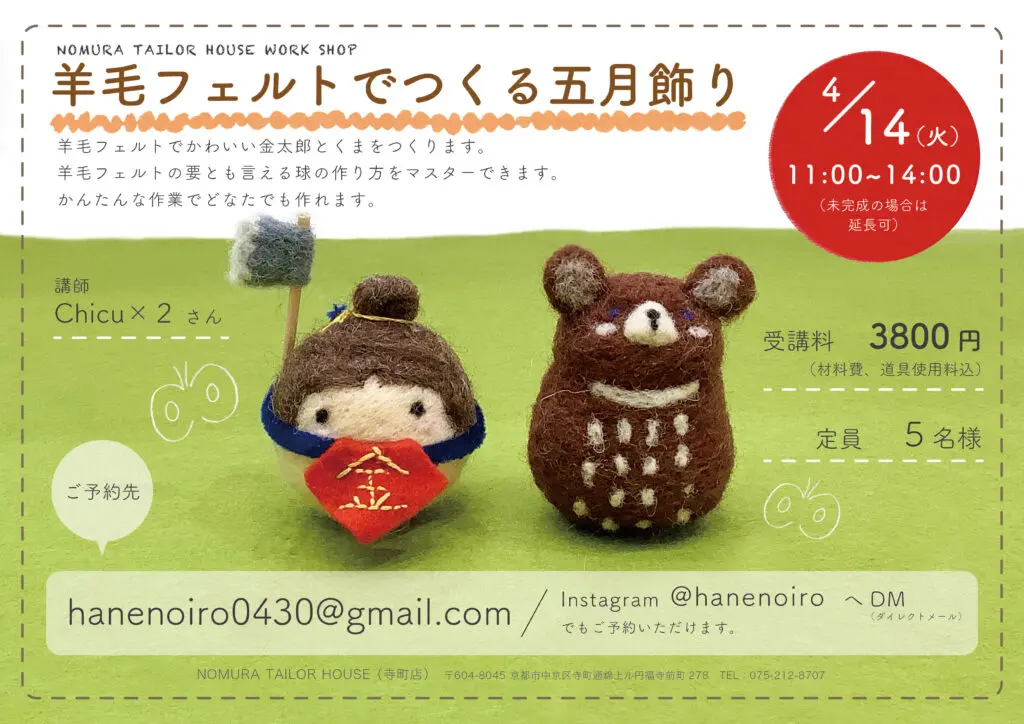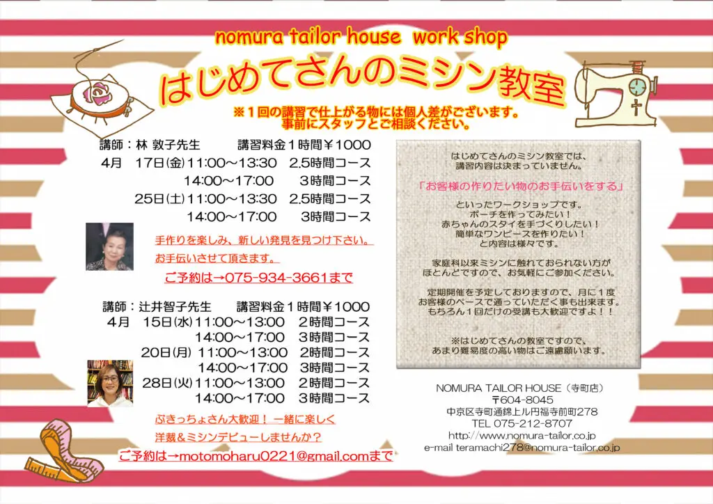 4月のワークショップ 寺町店 2020/03/10 こんにちは、ノムラテーラーハウスです(^^)/ 4月のワークショップの予定をお知らせいたします。 各ワークショップの担当講師の方へ、直接ご予約ください。(‘◇’)ゞ <次回のハギレセール はじめての手まり ワークショップ> カテゴリ すべて オンラインショップ 四条本店 寺町店 そのほか 一覧に戻る