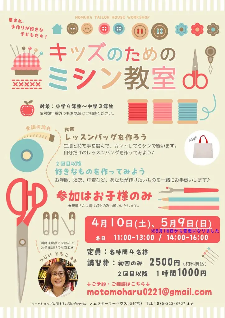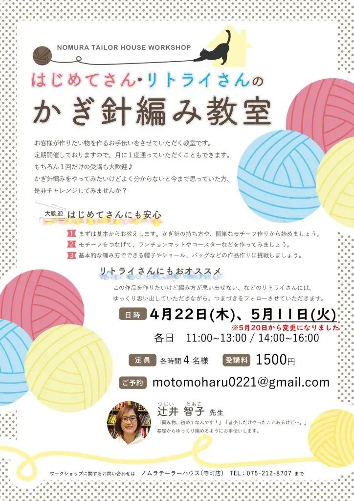 かぎ針編み、キッズのためのミシン教室、初めてさんのミシン教室の5月分日程に変更がございます。訂正文を掲載しました。ご注意ください。
