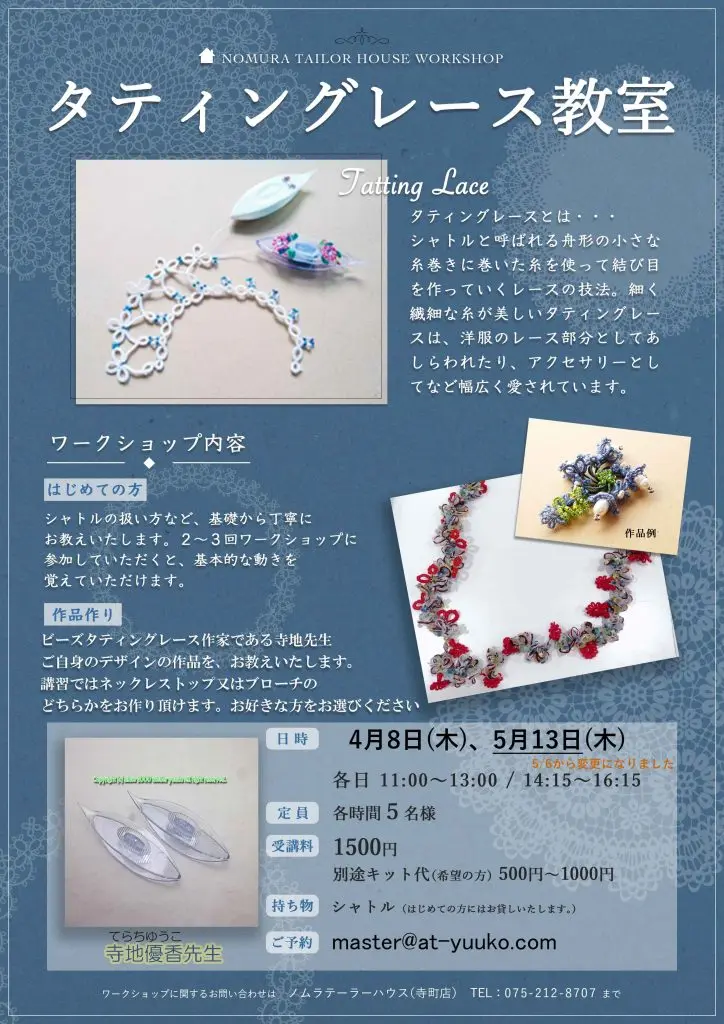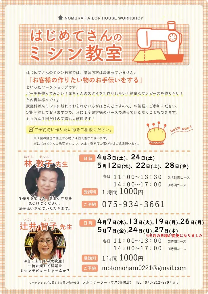 タディングレース教室、初めてさんのミシン教室の5月分の日程に再度変更がございます。三度変更になりご迷惑お掛け致しますことお詫び申し上げます。