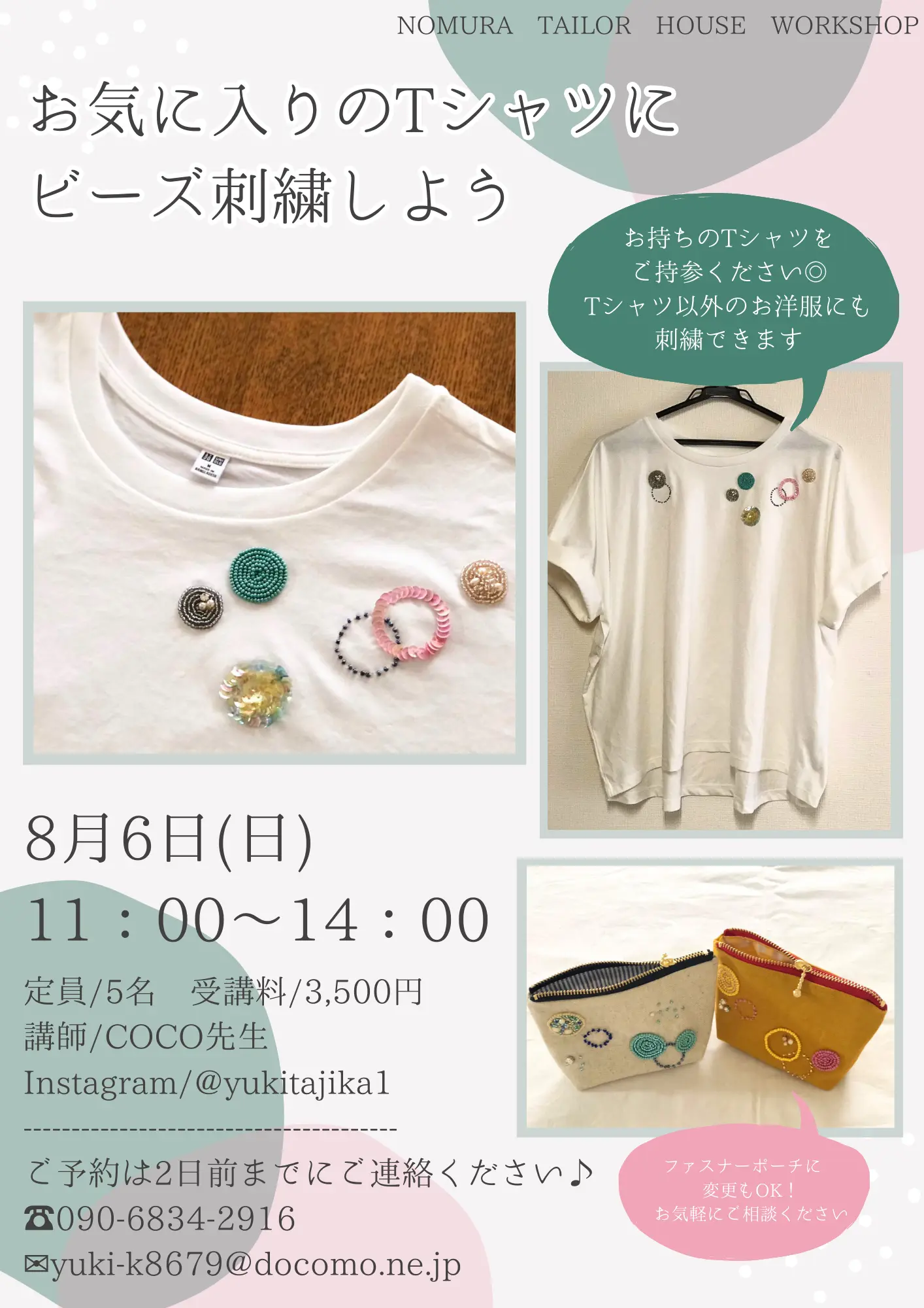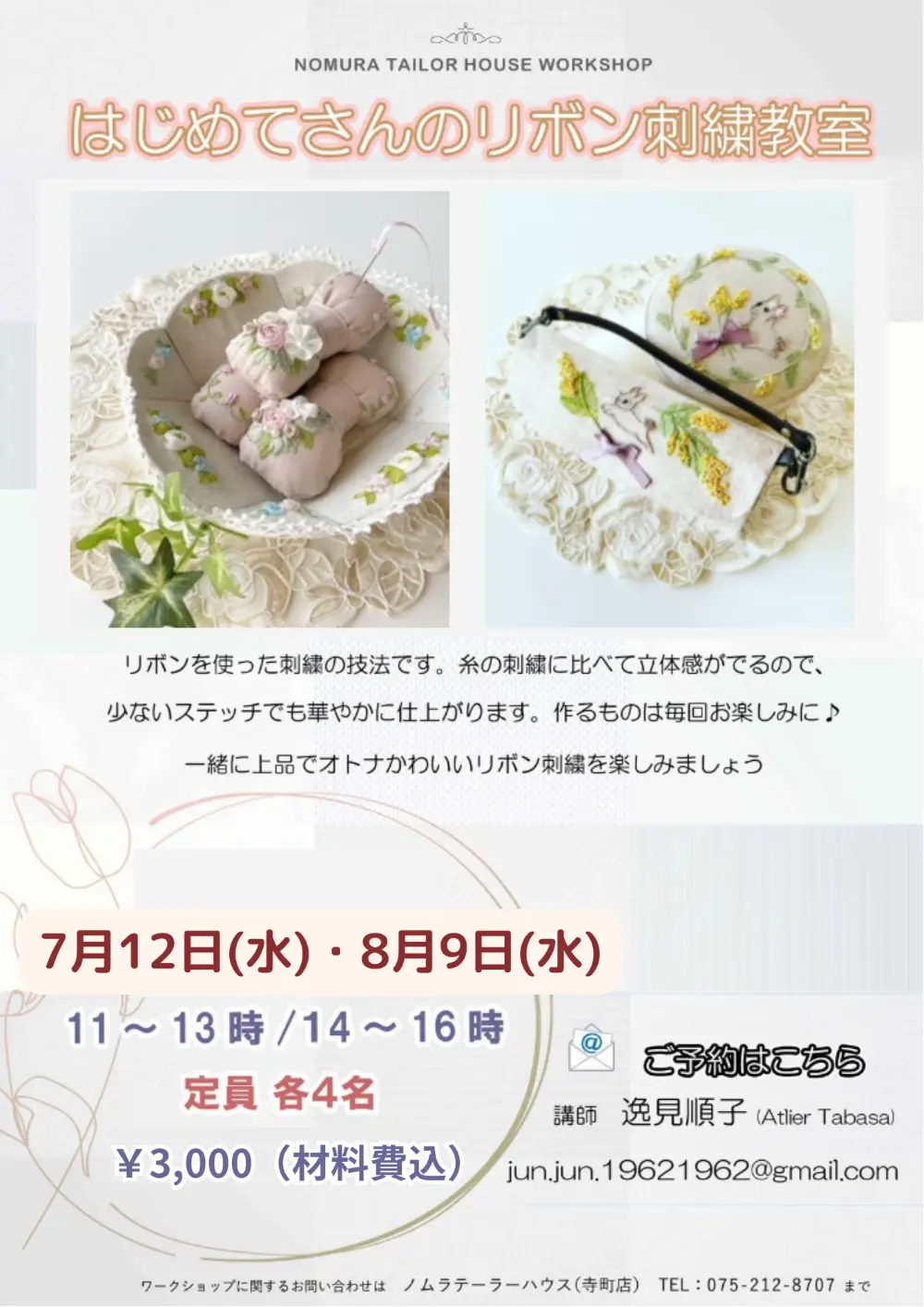 【寺町店】7月・8月ワークショップのお知らせ 寺町店 2023/06/27 こんにちは😊ノムラテーラーハウスです🏠 7月と8月のワークショップのご案内です✨ 寺町店では様々なワークショップを毎月開催しています! 寺町店は商店街のアーケードの中にあるので、お店にもお越しいただきやすいです◎ 講習は少人数で行われ、やさしい先生たちが丁寧に教えてくださいますので、少しでもご興味がある方はぜひお気軽にお問合せ下さいませ😊 ※ご予約は各ワークショップのご連絡先にて承っております <【寺町店】7月開催 レジンワークショップ 【寺町店】明日はハギレセール!> カテゴリ すべて オンラインショップ 四条本店 寺町店 そのほか 一覧に戻る