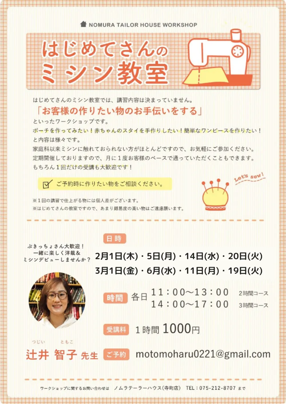 2月・3月ワークショップのお知らせ 寺町店 2024/01/26 こんにちはノムラテーラーハウスです♪ 2月と3月のワークショップのご案内です。 寺町店では様々なワークショップを毎月開催しています! 寺町店は商店街のアーケードの中にあるので、お店にもお越しいただきやすいです◎ 講習は少人数で行われ、やさしい先生たちが丁寧に教えてくださいますので、少しでもご興味がある方はぜひお気軽にお問合せ下さいませ✨ ※ご予約は各ワークショップのご連絡先にて承っております! <1月ハギレセールのお知らせ 明日はハギレセール!> カテゴリ すべて オンラインショップ 四条本店 寺町店 そのほか 一覧に戻る