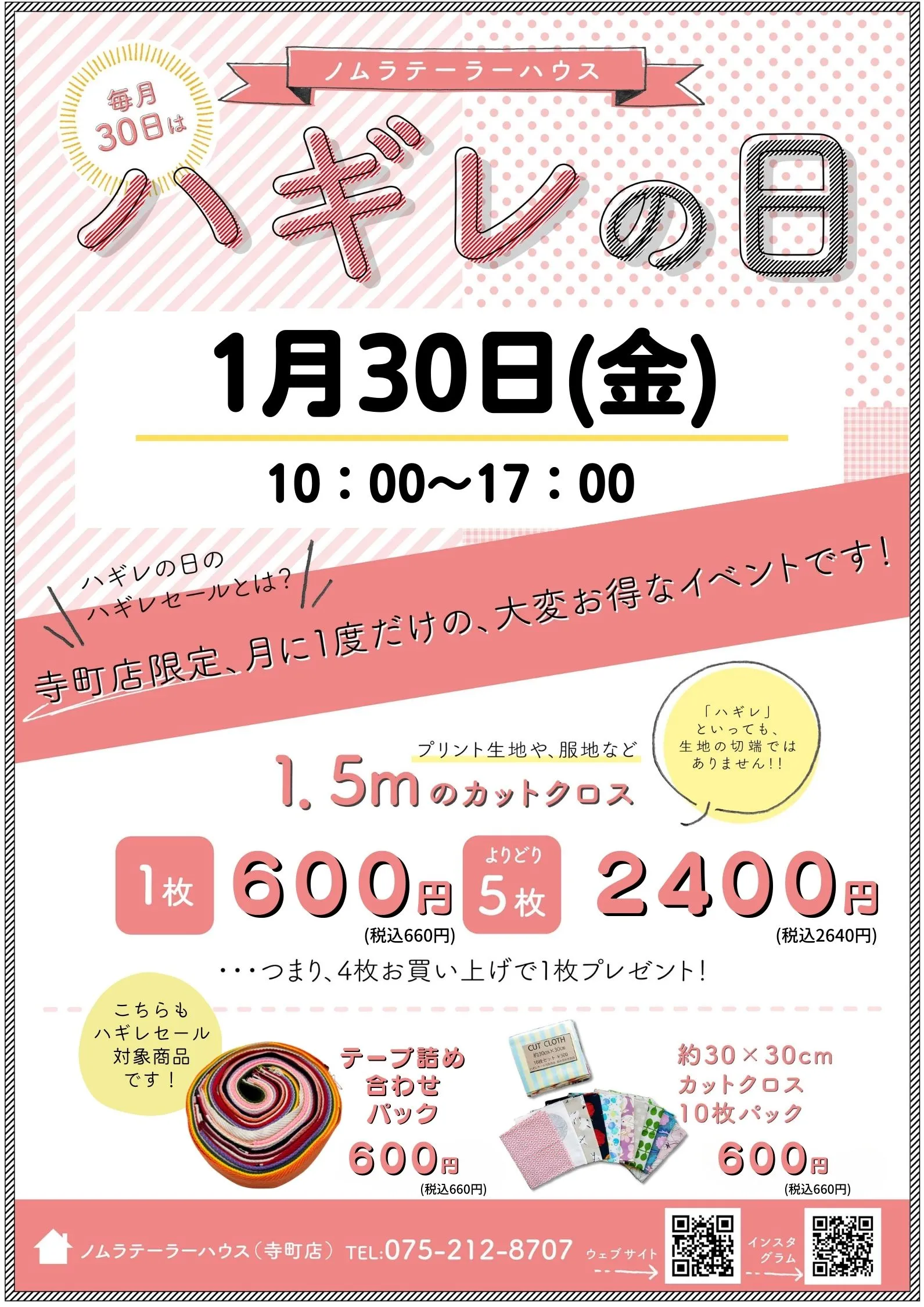 1月ハギレセールのお知らせ 寺町店 2026/01/05 こんにちは!ノムラテーラーハウスです😊 1月のハギレセールのお知らせです🏠 今月のハギレセールは、 《 1月30日(金) 10:00~17:00 》に開催します❣ みなさまのお越しをお待ちしております☺ <《2026年1月》ノムラテーラーコラボ生地特別ディスプレイ展開中! 《西利×ノムラテーラー》コラボ生地・キット発売決定!> カテゴリ すべて オンラインショップ 四条本店 寺町店 そのほか 一覧に戻る