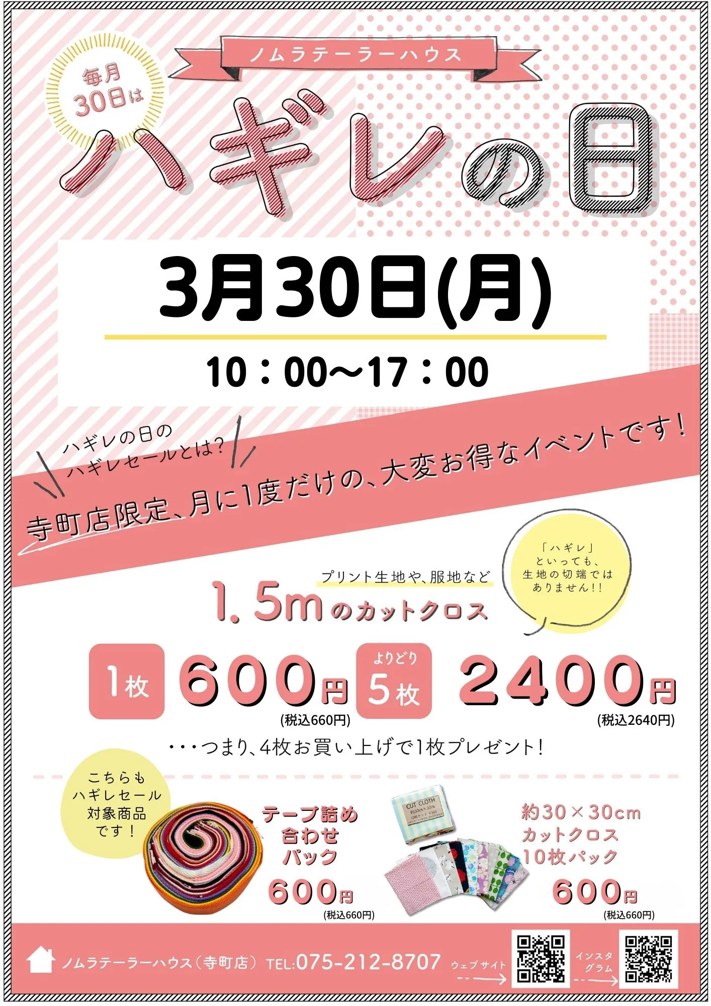 3月ハギレセールのお知らせ 寺町店 2026/03/01 こんにちは!ノムラテーラーハウスです😊 3月のハギレセールのお知らせです🏠 今月のハギレセールは、 《 3月30日(月) 10:00~17:00 》に開催します❣ みなさまのお越しをお待ちしております☺ <4月開催 かぎ針編みワークショップ 《3月》メインディスプレイが新しくなりました!> カテゴリ すべて オンラインショップ 四条本店 寺町店 そのほか 一覧に戻る