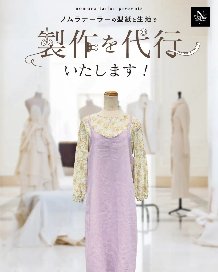ノムラテーラーで販売している型紙(お洋服などを作る際に使用する、原寸大で作られた設計図)の中から作られたい型紙と、使われたい生地をお選びいただき、その後の製作部分を代行させていただくサービスになります※