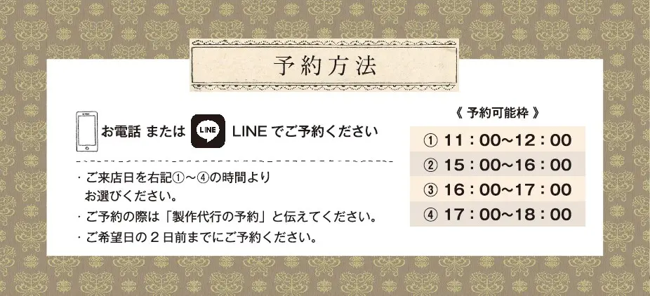 ★お電話の際は「製作代行の予約」と伝えてください。