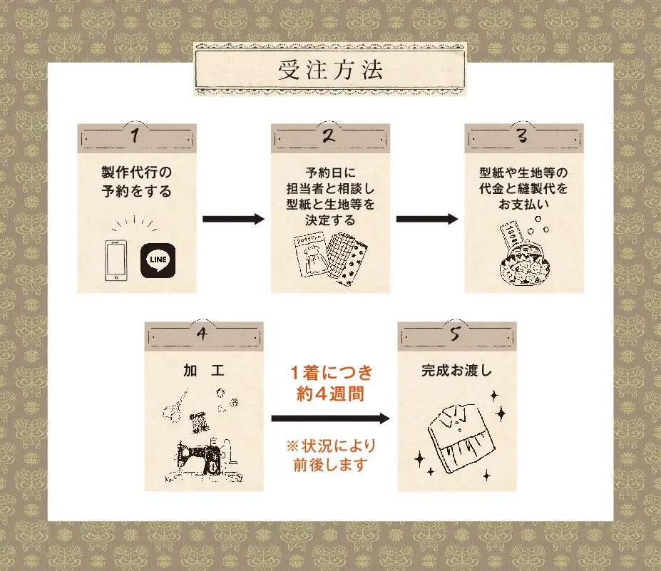 ※持ち込みの型紙・持ち込みの生地でのオーダーはトラブル防止のため出来かねます。