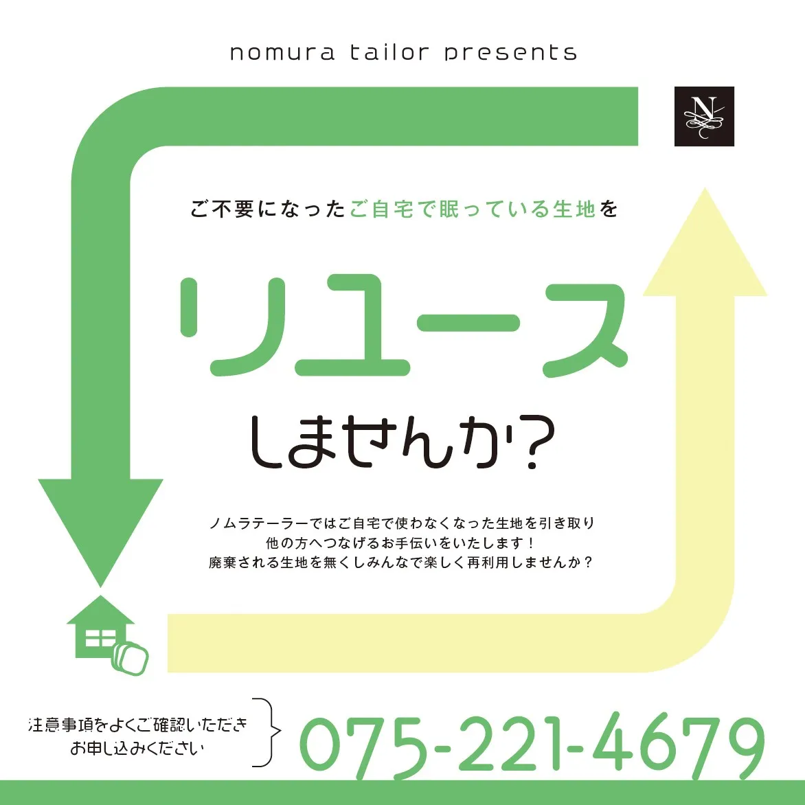 ノムラテーラーではご自宅で使わなくなった生地を引き取り、他の方へつなげるお手伝いをいたします!