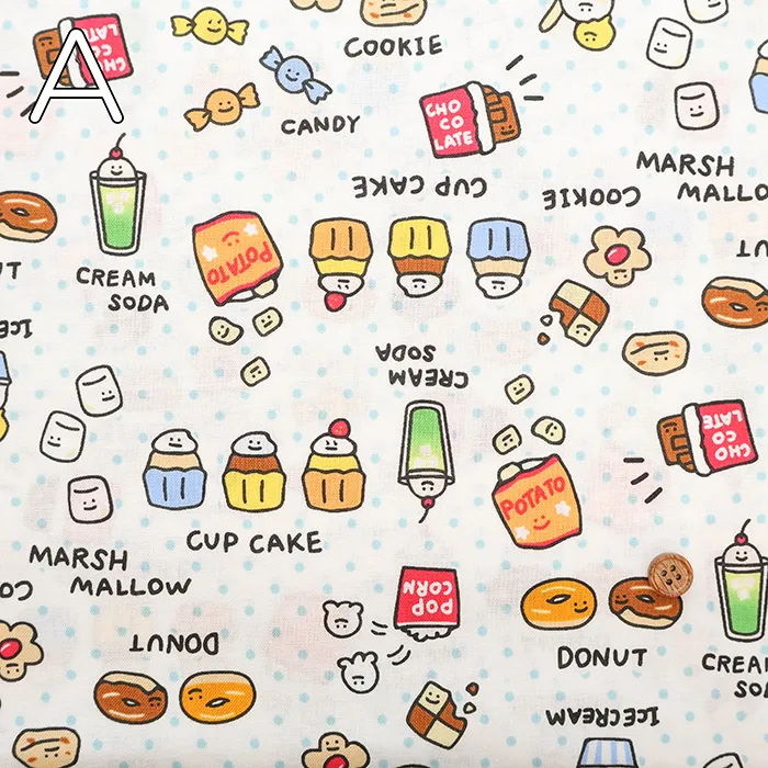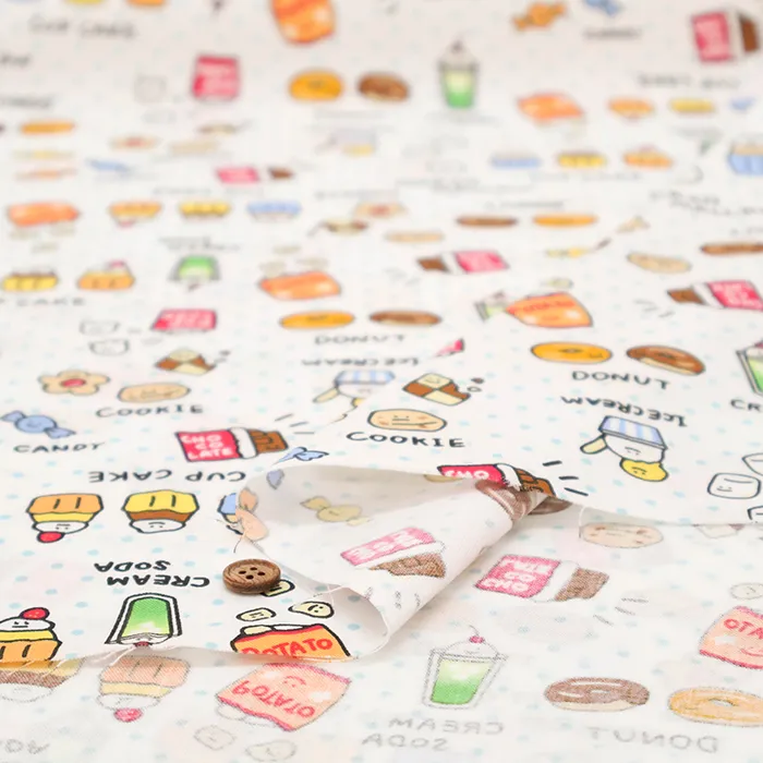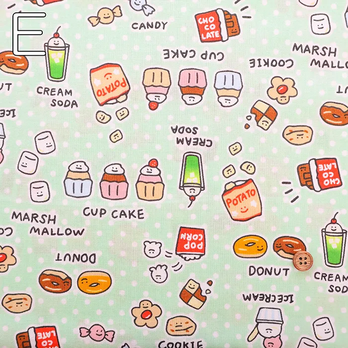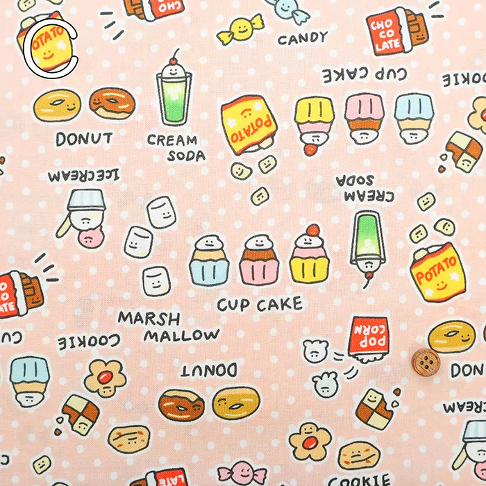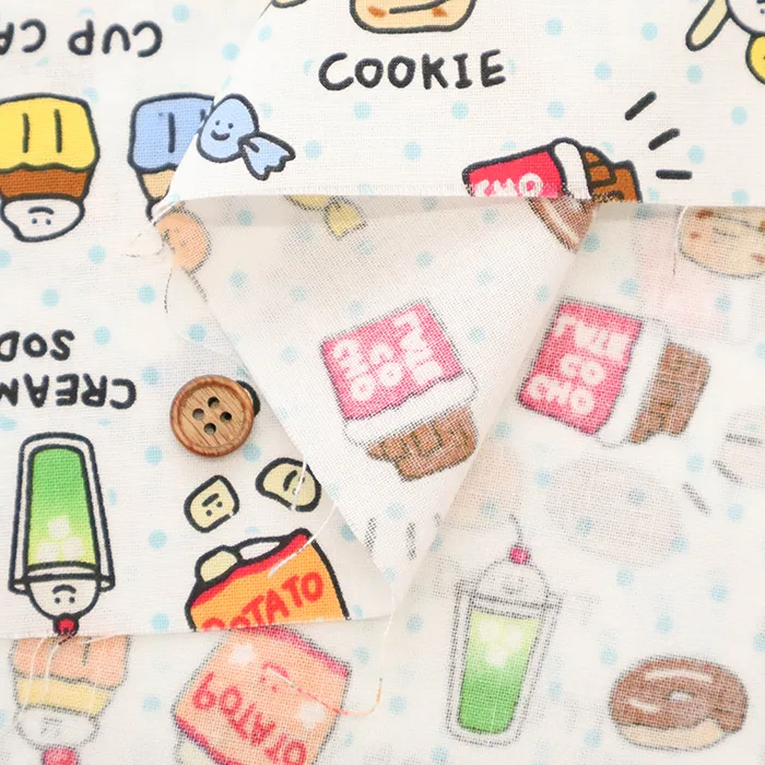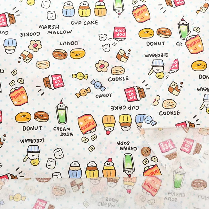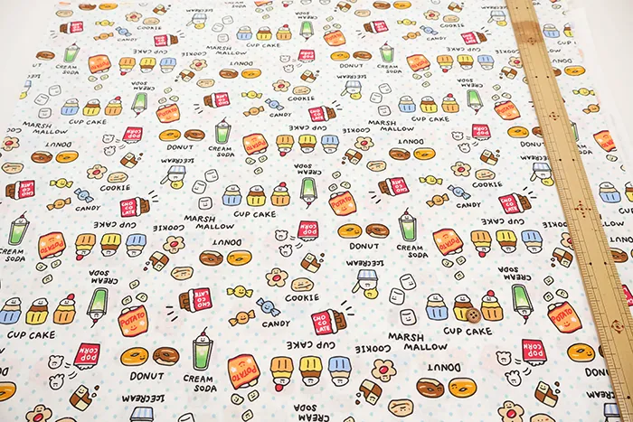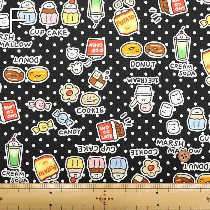 コットンシーチングプリント生地 ~MAHO~ food yuru ワイワイおかし柄