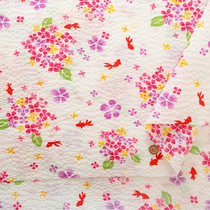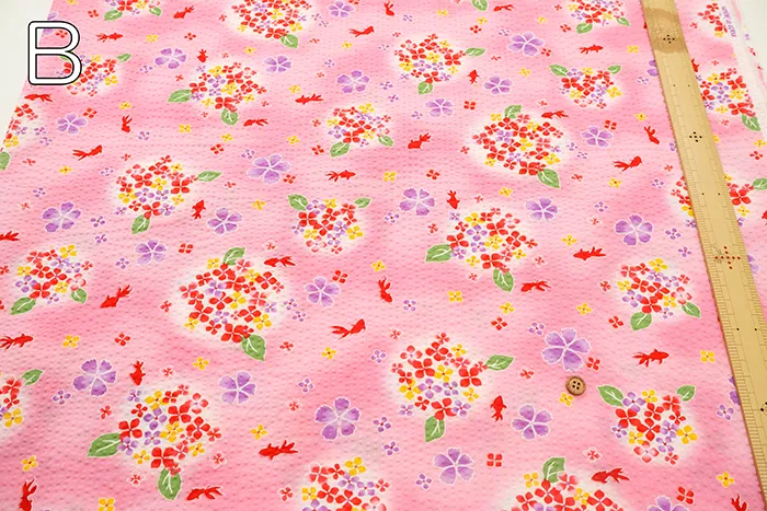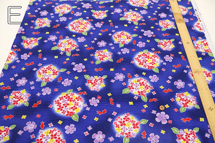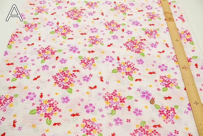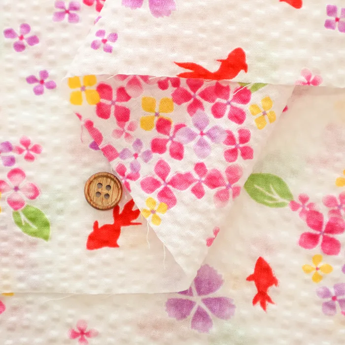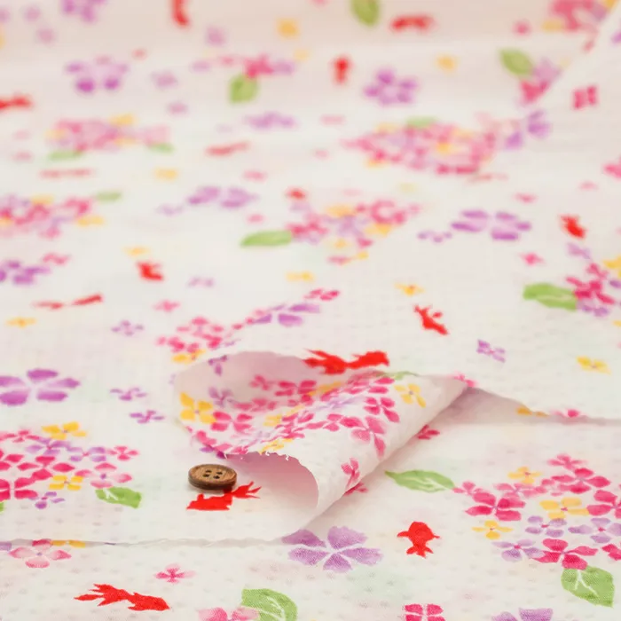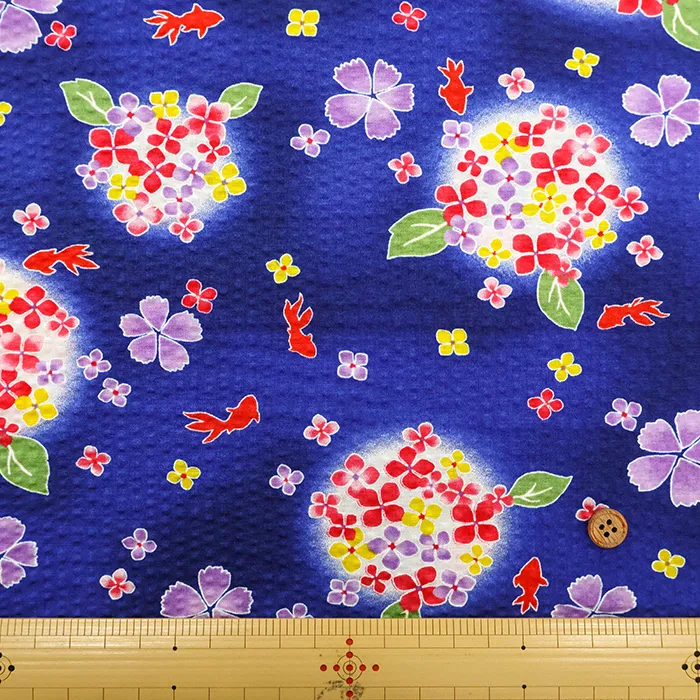 コットンリップルプリント生地 あじさいと金魚