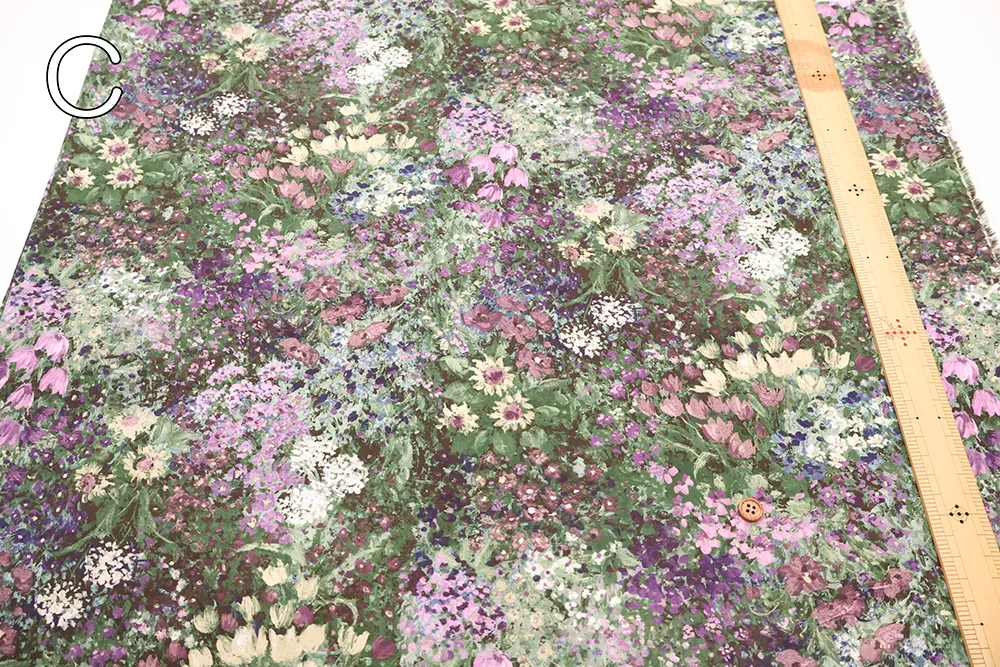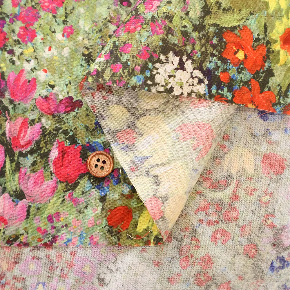 細番手の糸を平織りにしたローン生地に、鮮やかできれいな色合いが表現できるインクジェットプリントを使用した生地です。