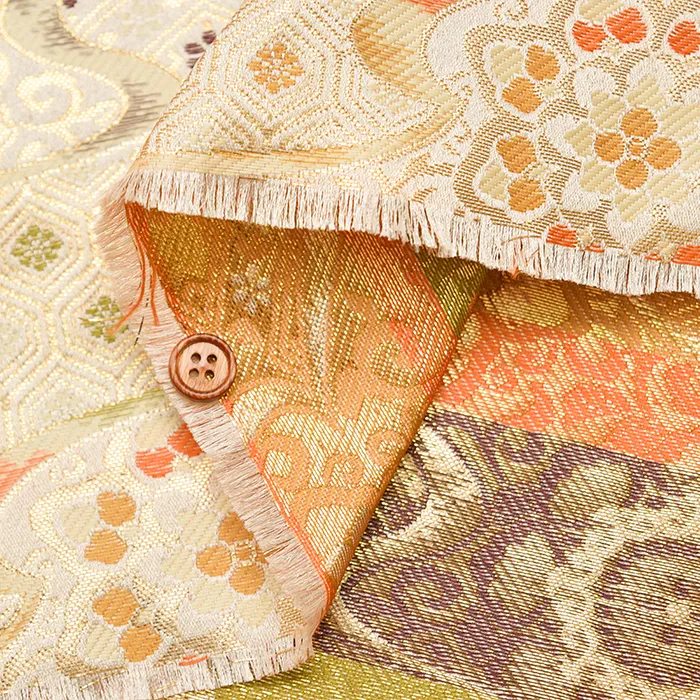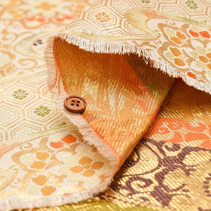 金糸や銀糸に色糸を交えて緯糸にし、紋様が浮き上がるように織った紋織物のひとつです。