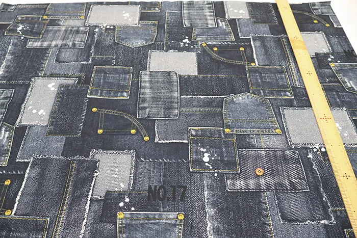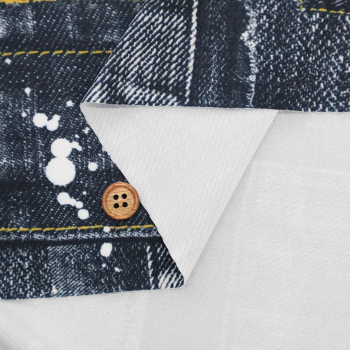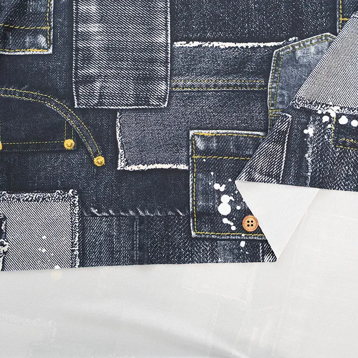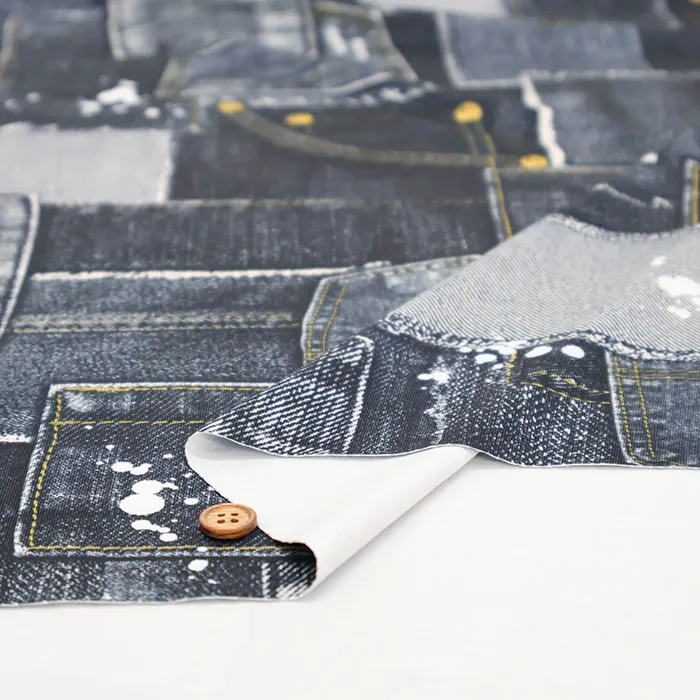 中国製 ポリエステルインクジェットニットプリント生地 MLT×COSMO デニムパッチ