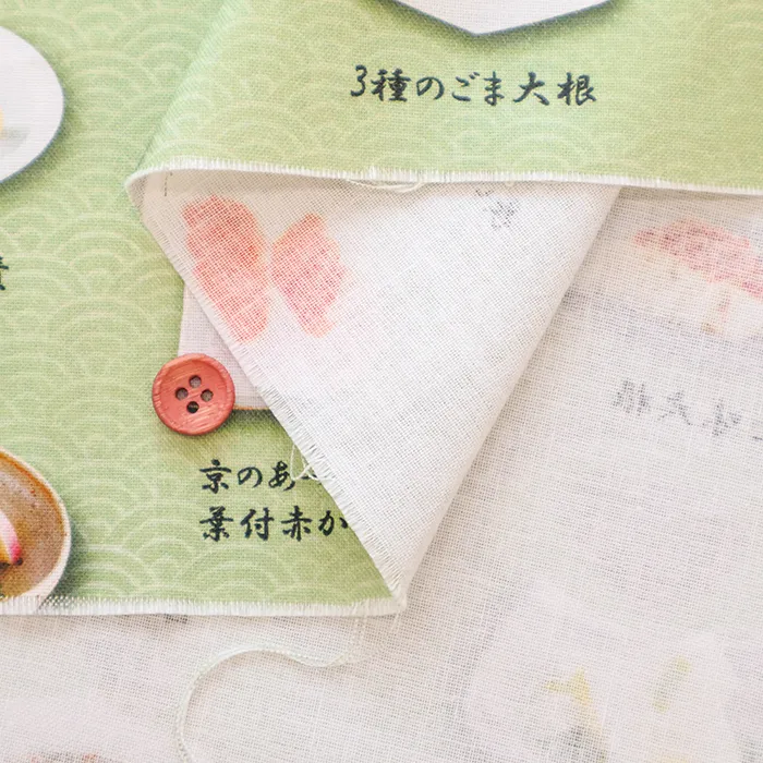京漬物の代名詞「千枚漬」を始めとした、たくさんの漬物が名称付きでデザインされた生地になります。