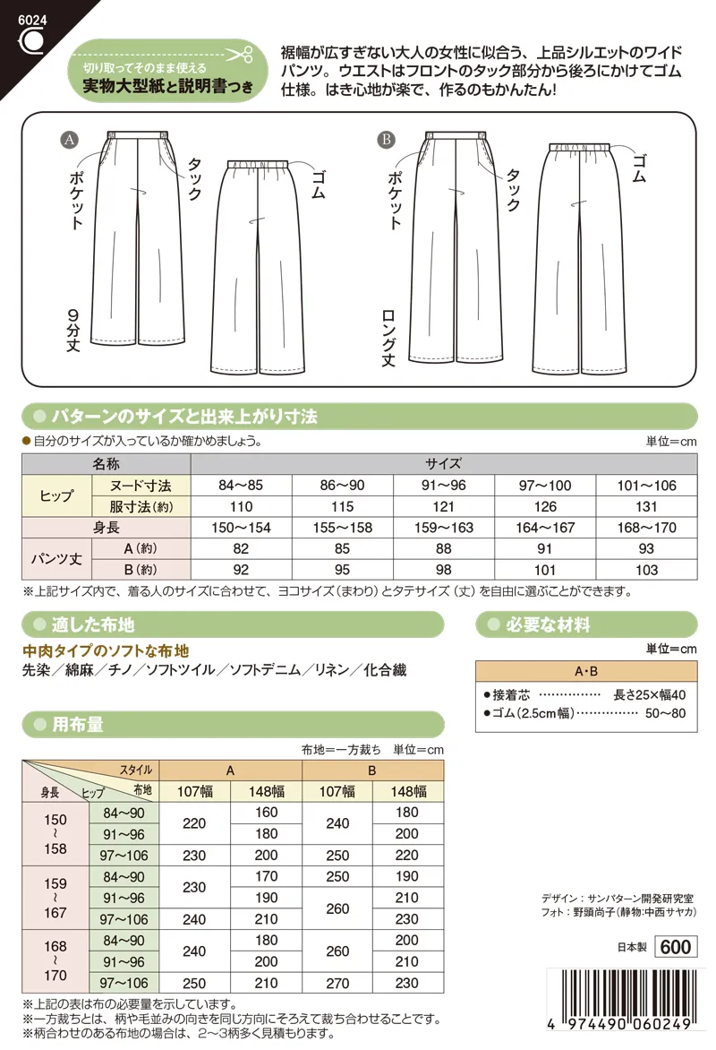 裾幅が広すぎない大人の女性に似合う、上品シルエットのワイドパンツのパターンです。
