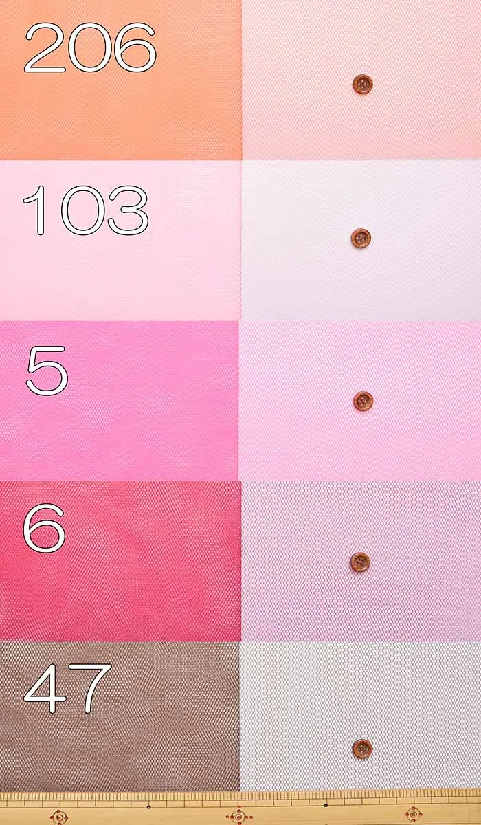 チュール生地は糸の太さの違いから、ハリや堅さもいろいろありますが、こちらは50デニール相当の厚みのチュール。