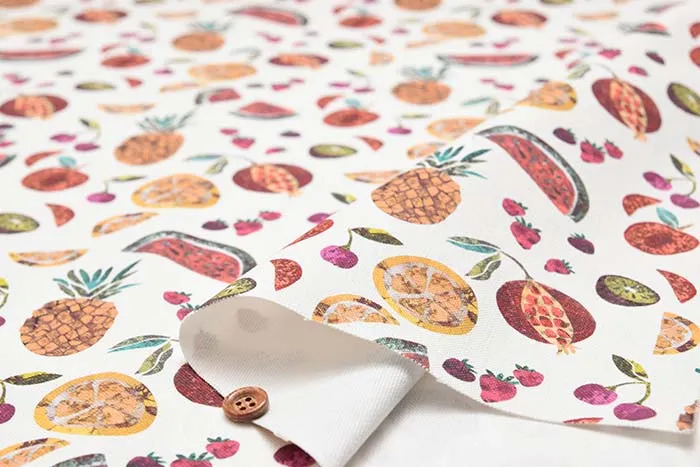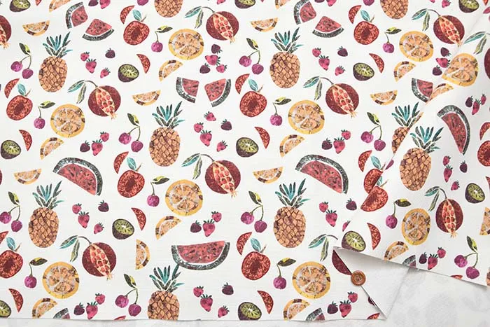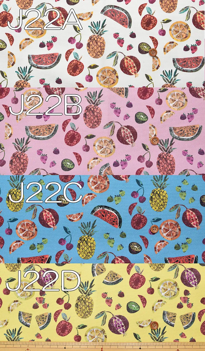 古い装飾美術のひとつピエトラ・デュラにインスパイアされたコラージュ技法を用いて、色とりどりのトロピカルフルーツを描いています。
