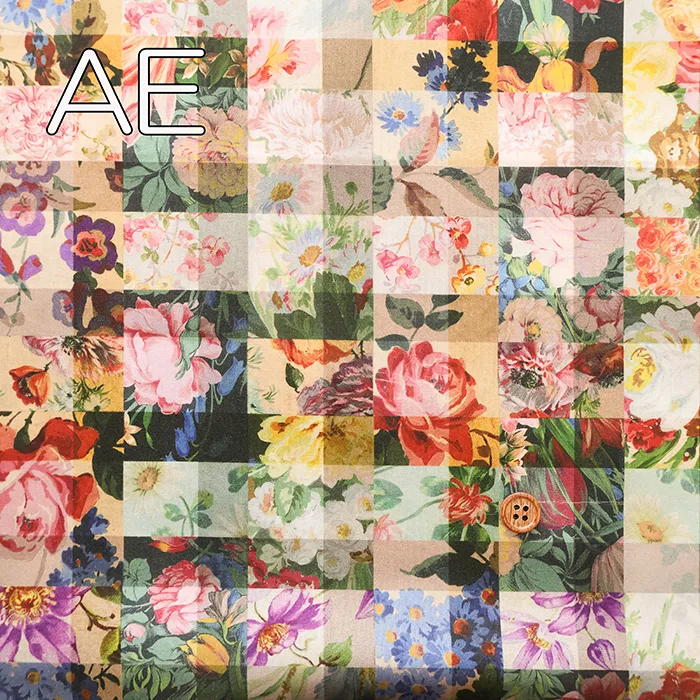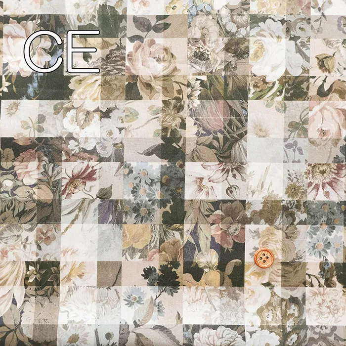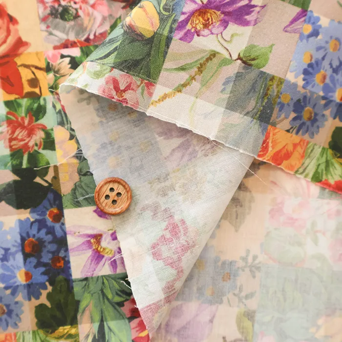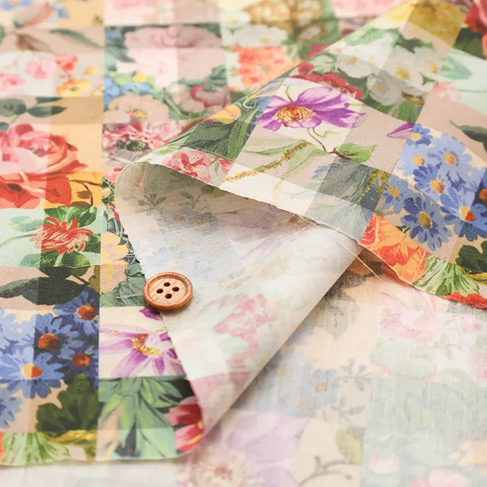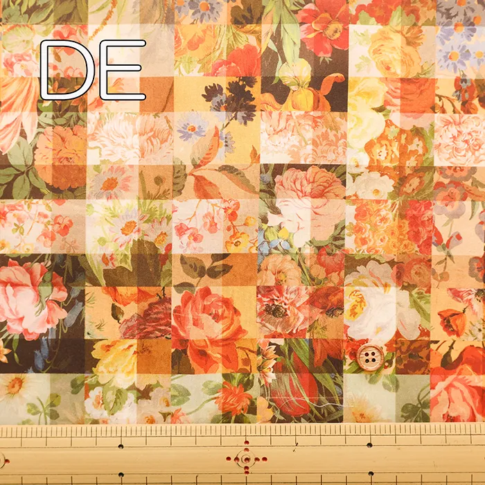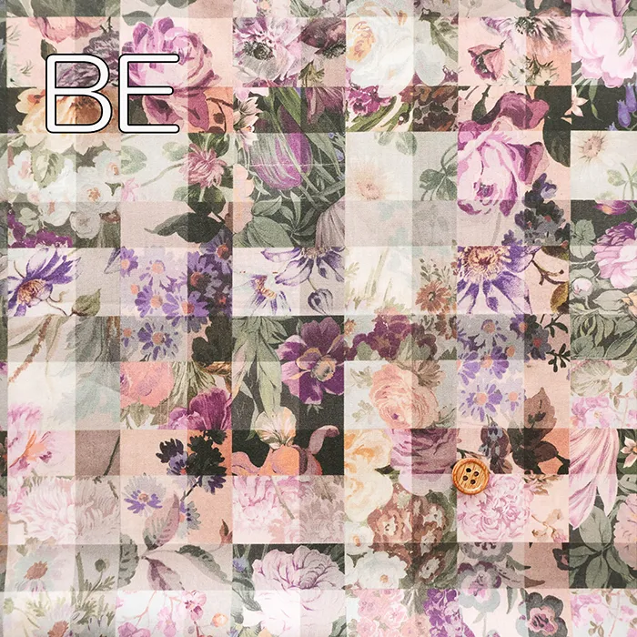 リバティのアーカイブに所蔵されているいくつかの手描き作品を繋ぎ合わせて作られたパッチワークの花柄は、チェック柄になるように慎重に構成されました。キク、バラ、チューリップ、デイジー、シャクヤク、クレマチスの花が格子から覗き、光と影の部分が独特の空間観を生み出しています。