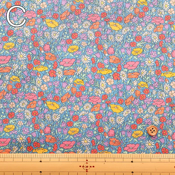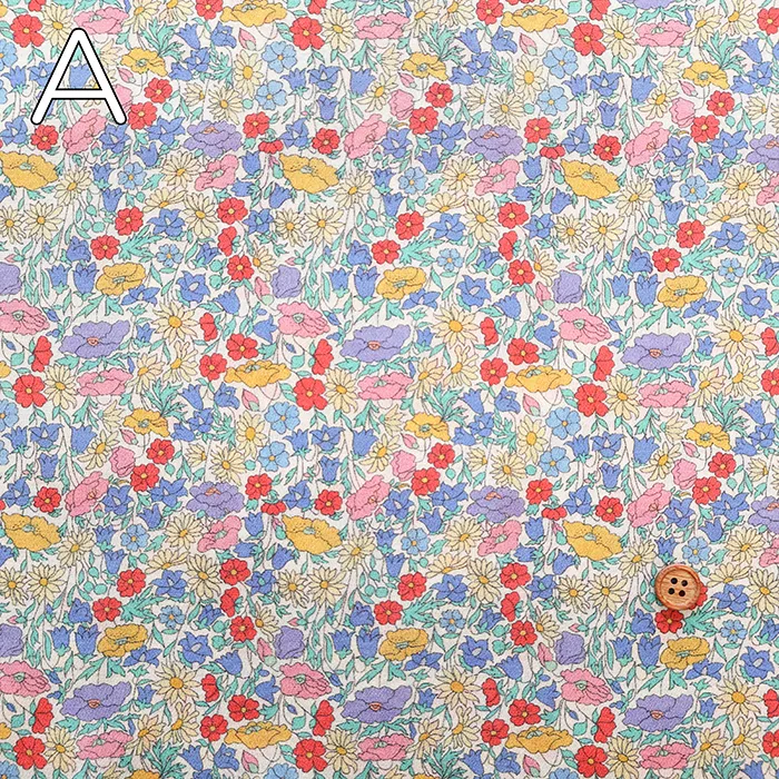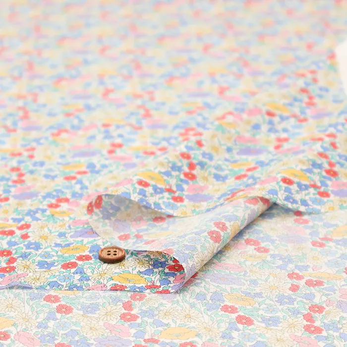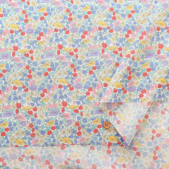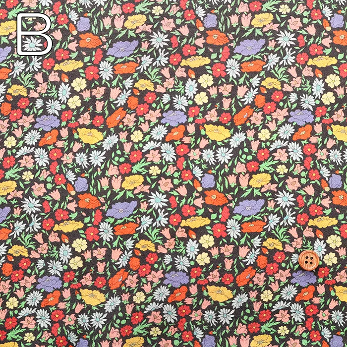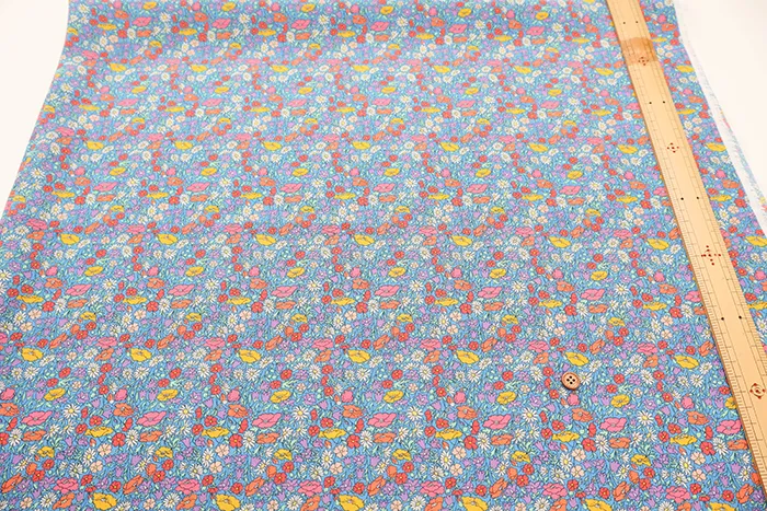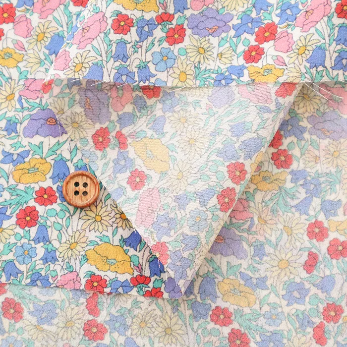 この最新デザインはリバティファブリックススタジオで制作され、小中サイズの花柄を複雑に組み合わせ、生い茂る葉がアクセントになっています。