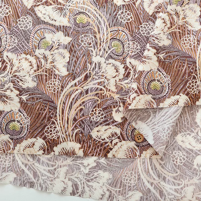 1880年代からリバティの芸術的アイデンティティを定義してきた2つのシグネチャースタイルを融合させた素晴らしいデザインです。当時流行していた美的運動と日本のデザインにちなみ、アイコニックな「ヘラ」と1900年代初頭の美しい柄「ハナ」を融合させました。洗練された退廃的な雰囲気が漂うヘラの孔雀の羽が、洗練されたポピーと散りばめられた花々によって引き立てられています。