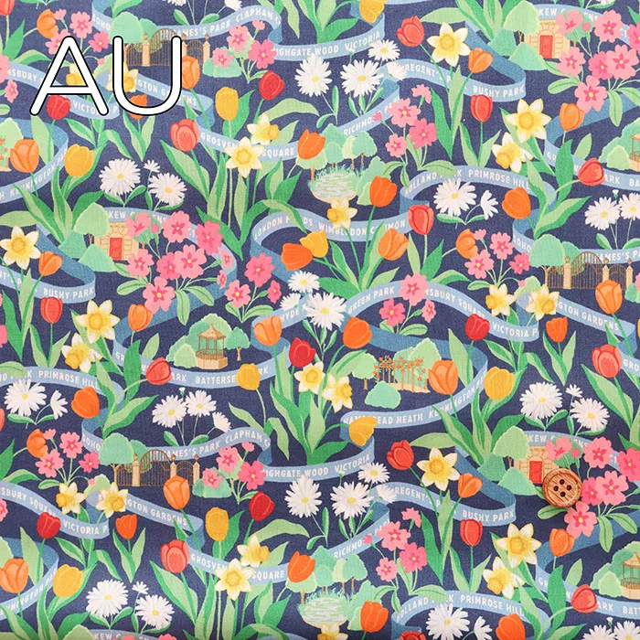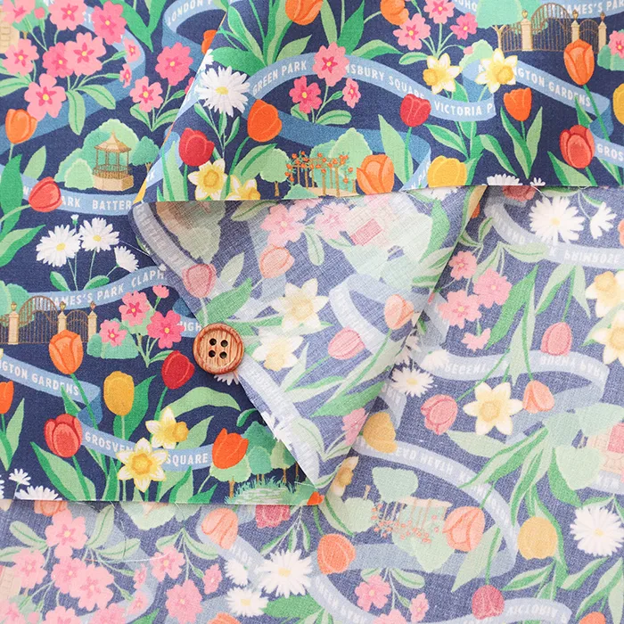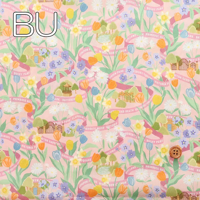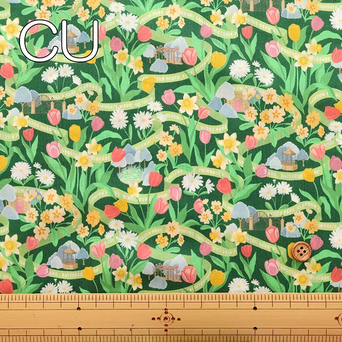 ロンドンの公園は春になると、色とりどりのチューリップ、ダフォディル、プリムローズ、デイジーが花壇や広場を彩り、街全体が鮮やかな色に包まれます。このデザインは、ガッシュで丹念に手描きされ、豊かな色彩が感じられます。花々の間には小さなシーンが隠れ、まるで道のようにデザインの中を織りなすリボンが、ロンドンの多くの緑地の名前をさりげなく表現しています。