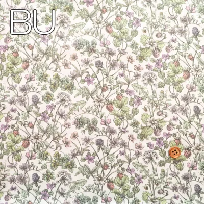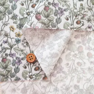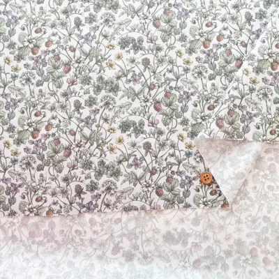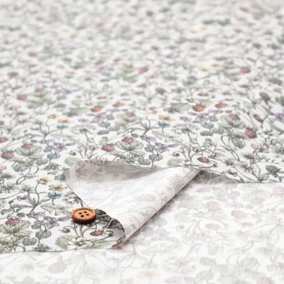 「スプリング・メモリーズ」の花のモチーフの一部を取り入れた、遊び心あふれるコーディネート柄です。花咲く草原に身を委ね、自然の生命力と静かな調和に包まれる、のびやかで心地よいひとときを想起させます。やわらかな鉛筆の濃淡によって繊細に手描きされた構成の中には、豊かな野花の庭が広がり、デイジーやキンポウゲ、クローバー、スミレ、タンポポ、ワスレナグサが咲き誇る風景の中に、熟したストロベリーがさりげなく描き込まれています。