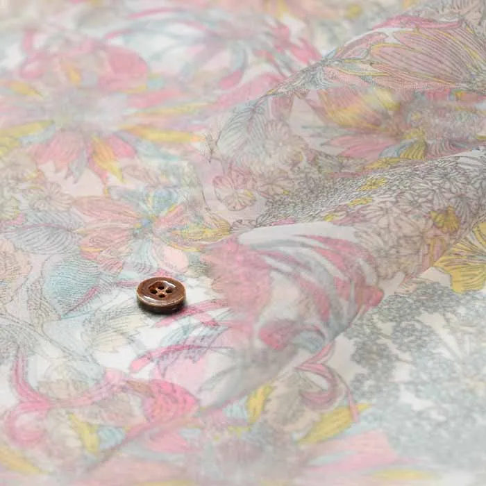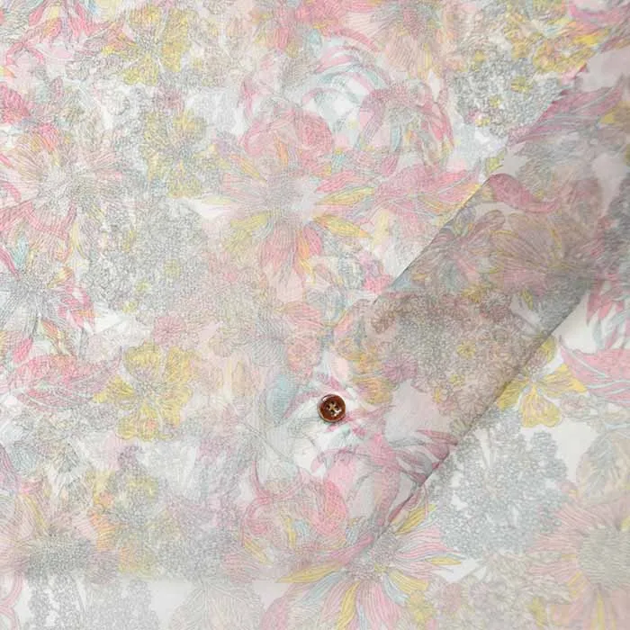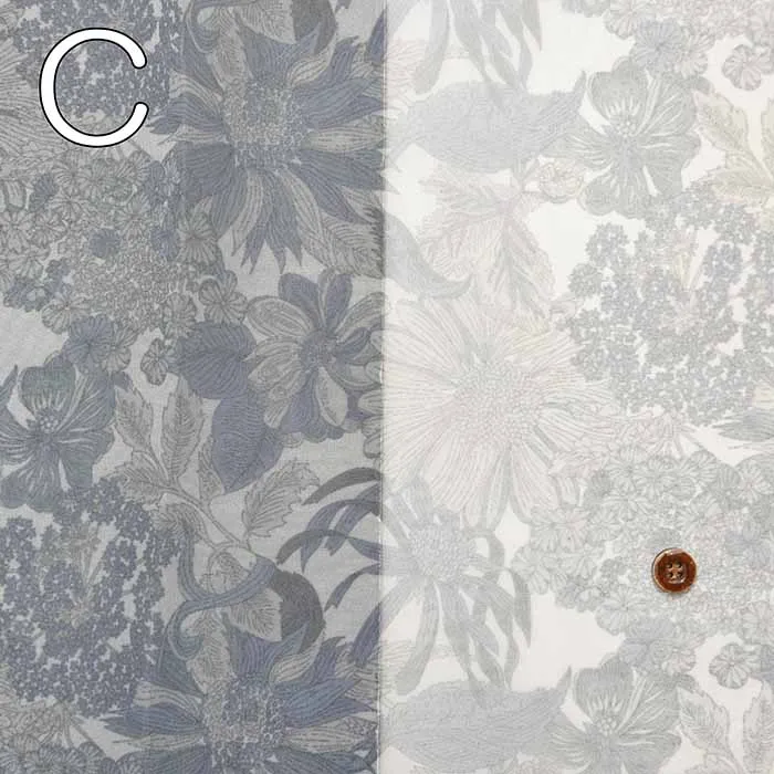 リサイクルPET繊維を使用した、サンコロナ小田オリジナルの「リサイクルポリエステルオーガンジー」に、リバティジャパンとしては初めて「転写プリント」を用いた、水を使わず汚水を出さない、環境配慮型の新たなサステナブル素材となっております。