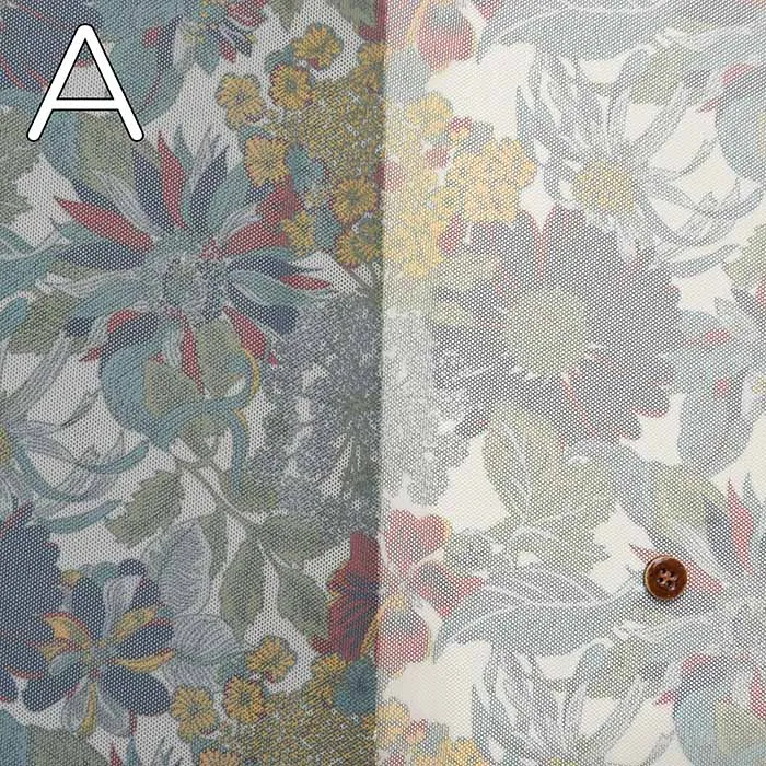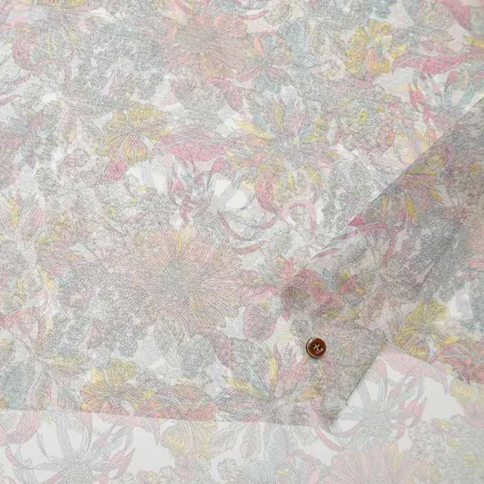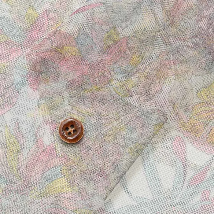 リサイクルPET繊維を使用した、サンコロナ小田オリジナルの「リサイクルポリエステルチュール」に、リバティジャパンとしては初めて「転写プリント」を用いた、水を使わず汚水を出さない、環境配慮型の新たなサステナブル素材となっております。