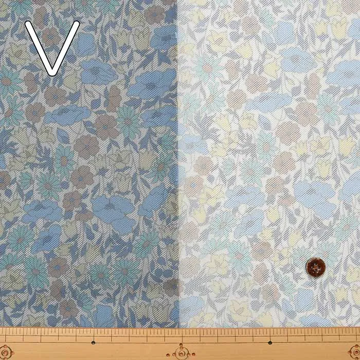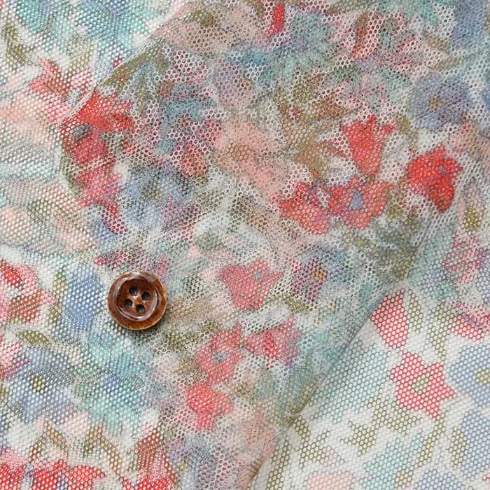 リサイクルPET繊維を使用した、サンコロナ小田オリジナルの「リサイクルポリエステルチュール」に、リバティジャパンとしては初めて「転写プリント」を用いた、水を使わず汚水を出さない、環境配慮型の新たなサステナブル素材となっております。